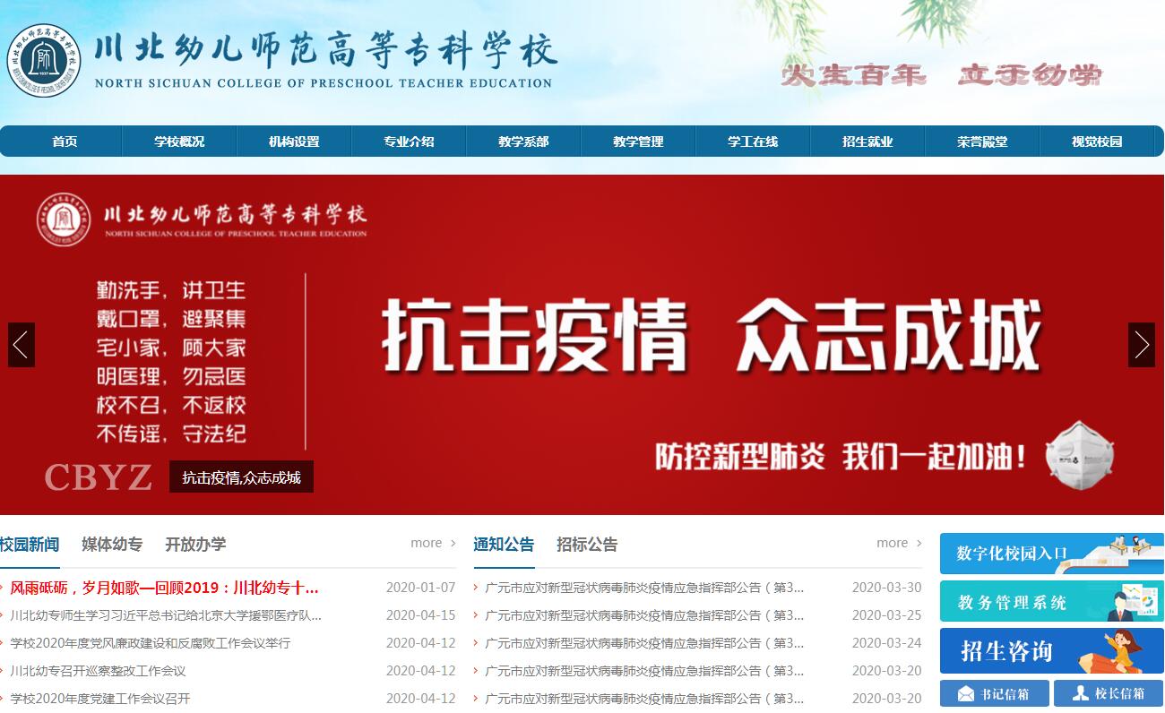 川北幼儿师范高等专科学校是经四川省人民政府批准成立的公办全日制普通高等专科学校。学校的前身为发端于1902年、创办于1937年,受国家教委表彰的全国百所先进师范学校之一——四川省广元师范学校。学校具有百年师范办学传统,人文气息浓郁,文化积淀丰厚。1938年8月张澜先生(新中国第一届中央人民政府副主席)视察学校,向全校师生诠释的“智、仁、勇”教育思想,成为数代师生发愤自雄一往无前的奋斗理想。学校坐落于女皇故里、剑门蜀道、全国最宜人居城市——广元。学校依山傍水而建,各式建筑清新典雅,错落有致;校园绿树掩映,花木葱茏,环境优雅。长期以来,学校肩负“幼有良教,教有良师”的历史使命,弘扬“负重自强,开拓进取”的学校精神,秉承“学高身正,志远行端”的校训准则,培育“以教明德,以文化人”的幼专文化,万千桃李,处处芬芳,教师愉快地努力工作,学子幸福地健康成长,为国家基础教育和地方经济社会的和谐发展做出了重要贡献。学校占地面积503亩,校舍建筑面积近18万平方米。校内建有学前教育、教师专业能力发展、信息技术、科学探究、心理健康教育、艺术教育、社会服务与经济管理等七大实训中心,有舞蹈教室、音乐教室、美术教室、电子钢琴教室、微格教室、多媒体教室、语音教室等专业功能用房200余间。有设施齐全、功能完善的演播厅、学术报告厅、阶梯教室、阅览室、电子阅览室。有标准化的体育场,完善的体育设施设备。图书馆藏纸质图书近50万册,电子图书31万册,各类学术期刊423种。有附属幼儿园3所(含1所在建),校外教育实习基地179所。学校坚持文理并重、基础宽厚、突出应用与创新的办学特色,设置有学前教育系、初等教育系、语言文学系、经济管理系、音乐舞蹈系、美术系、体育系、健康管理系、继续教育部、思想政治理论课教学科研部等10个系部,开设有学前教育、早期教育、小学教育、语文教育、英语教育、音乐教育、舞蹈教育、美术教育、体育教育、数学教育、汉语、环境艺术设计、建筑经济管理、会计、旅游管理、老年服务与管理、护理、康复治疗技术、现代教育技术、科学教育、心理健康教育等23个大专专业(含2个五年制大专专业)。其中,中央财政支持建设的专业2个。现有全日制在校学生近7570人。学校坚持打造“求真尚美、和而不同”的校风和“知行合一、孜孜以求”学风,全面关爱学生的成长,在加强德育、培养创新精神和实践能力的同时,尊重和发展学生个性,不断提升人才培养质量。毕业生以其素质全面、富于开拓、基础扎实、技能过硬而备受社会各界青睐。学校拥有百年师范根基,具有丰厚教育资源。师资团队阵容整齐、结构合理、学术精湛、锐意创新。现有教职工398人,其中研究生164人,教授、副教授76人;兼职教师60余名;市学术和技术带头人、科技拔尖人才、广元名师25人。学校聘请中央电视台鞠萍等客座教授13人,外籍教师2人。立项教育部重点课题1项、省级课题82项,出版学术专著和主编教材90部,发表学术论文800余篇。人生百年,立于幼学。面对党和国家对学前教育的高度重视,广大百姓对学前教育的深切呼唤,社会各界对学前教育的殷切期待,学校今后将继续坚持“突出师范特色,强化一专多能,服务区域经济,引领地方文化”的办学定位,践行“师范为基,育人为本,开放创新,服务地方”的办学理念,构建“共同体协同育人,教学做三位一体”的人才培养模式,打造“五心兼备,一专多能”的学生品牌,成就学生、教师和学校一起成长共同发展的教育梦想,培养有理想信念、有道德情操、有扎实知识、有仁爱之心的高素质专业化幼儿园、小学教师和适应地方经济社会发展需要的具有社会责任感、创新精神和实践能力的高素质技术技能人才,为实现学校为幼为小,亦师亦范,办人民满意的全国一流幼专的奋斗目标再续新的传奇、再铸新的辉煌……