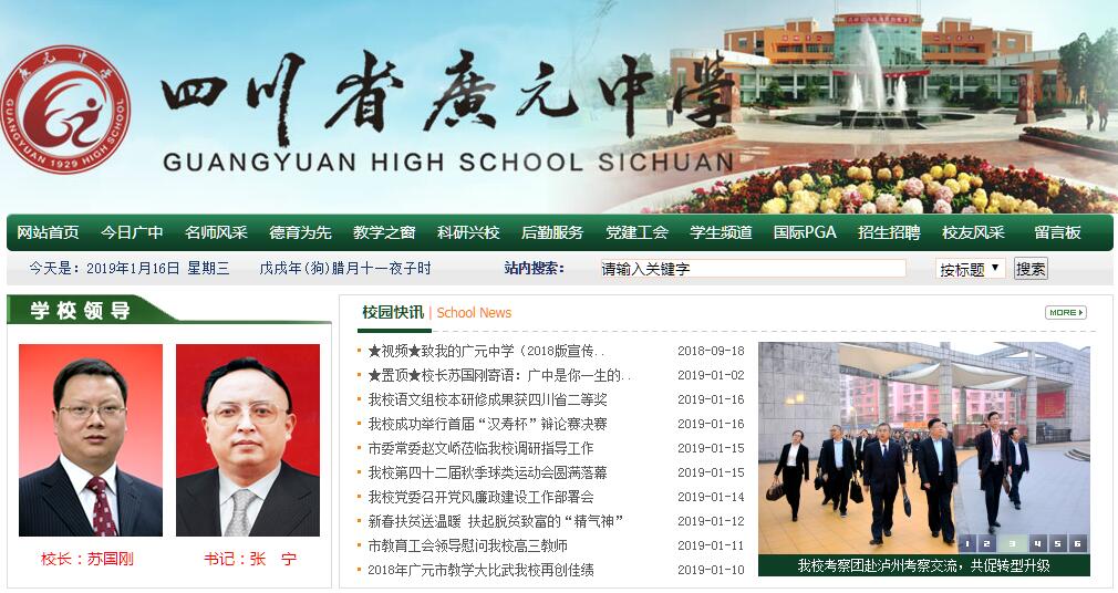 | 网站简介: 四川省广元中学位于广元市主城区,发轫于清康熙42年(公元1703年),置嘉陵书院,光绪16年(公元1890年)修葺嘉陵书院增其旧制,名曰汉寿书院,公元1929年更名为广元县立初级中学校,现代广元中学诞生,1994年成为四川省重点高中,2005年创建成国家级示范高中,2013年转评为首批四川省一级示范高中,现有师生员工6000余人。教育底蕴深厚,师资一流,环境优美,成绩突出,是广元高中教育品牌学校。秉持“博学广才,器识为先”办学理念,彰显“活动育人,和谐发展”办学特色,实现“学生成才,教师成功,学校发展”办学效益。高考成绩一直位居全市前茅,为清华大学、北京大学、香港大学输送新生30余人。荣获国家级示范性普通高中、全国中华优秀文化传承校、全国群众体育先进集体、全国五四红旗团委、全国未成年人思想道德建设先进集体、四川省文明校园、四川省校风示范学校、四川省阳光体育示范学校、四川省心理健康教育实验学校、四川省绿色学校、清华大学生源中学、国防七校优秀生源基地校等荣誉称号。 |