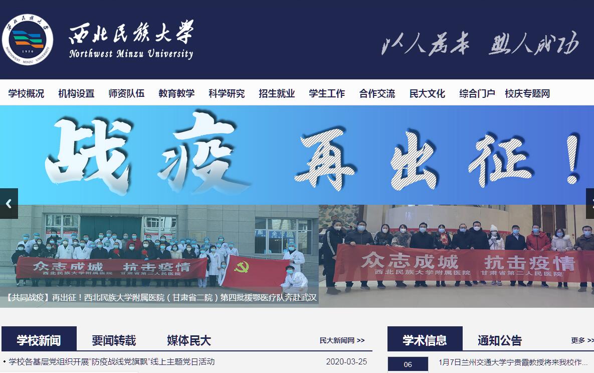西北民族大学是中华人民共和国成立后创建的第一所民族高等学校,隶属于国家民族事务委员会。学校肇始于1949年9月中国人民解放军第一野战军在兰州开办的藏民问题研究班和藏民学校,1950年1月改建为西北人民革命大学兰州分校第三部,1950年8月正式成立西北民族学院,2003年4月更名为西北民族大学。学校地处兰州市,建有两个校区,校园总面积1776亩,其中西北新村校区359亩,榆中校区1417亩;建筑面积735645.33平方米;图书资料394万余册;博物馆馆藏文物2964件;教学科研仪器设备总值4.1013亿元,固定资产总额35.44286亿元。2015年成为国家民委和教育部共建院校。2016年7月,国家民委和甘肃省人民政府签署共建协议。2017年被列为甘肃省高水平大学建设单位。学校扎根西北大地办大学,始终坚持立德树人的根本任务,始终坚持为国家战略和少数民族、民族地区经济社会发展服务,始终坚持把为民族地区培养“下得去、用得上、留得下、靠得住、干得好”的专门人才作为使命自觉,已培养各类人才16万余人。学校面向全国31个省(市、自治区)招生,现有56个民族全日制在校生26434人,其中本科生24248人,研究生1676人。2007年以“优秀”成绩通过教育部本科教学工作水平评估。学校现设有28个教学单位:马克思主义学院、经济学院、管理学院、法学院、民族学与社会学学院、教育科学与技术学院、体育学院、文学院、藏语言文化学院、蒙古语言文化学院、维吾尔语言文化学院、外国语学院、新闻传播学院、音乐学院、舞蹈学院、美术学院、历史文化学院、数学与计算机科学学院、电气工程学院、土木工程学院、化工学院、生命科学与工程学院、医学院、口腔医学院(口腔医院)、第一临床医学院、第二临床医学院、预科教育学院、继续教育学院。学校设有3个独立建制的科研机构:社会科学研究院、中国民族信息技术研究院、生物医学研究中心。学校坚持人才强校战略,建成了一支师德高尚、业务精湛、结构合理、充满活力的高素质专业化教师队伍。现有教职工1926人,其中专任教师1241人,正高级职称人员294人,副高级职称人员601人,博士生导师24人,硕士生导师349人。教师中有“国家百千万人才工程”人选1人,教育部“新世纪优秀人才支持计划”6人,享受国务院政府特殊津贴专家26人;国家民委突出贡献专家9人,领军人才6人,中青年英才培养计划12人;甘肃省跨世纪学科带头人11人,领军人才9人,优秀专家5人,“333”科技人才工程人选10人,“555”创新人才工程人选6人;学校有全国优秀教师2人,全国教育系统先进工作者1人,甘肃省教学名师6人,青年教师成才奖61人。学校有1个全国专业技术人才先进集体。学校是一所优势和特色比较鲜明的多学科门类的综合性大学。学科涵盖经济学、法学、教育学、文学、历史学、理学、工学、农学、医学、管理学、艺术学等11个学科门类,拥有71个本科专业,15个一级学科硕士学位授权点,2个二级学科硕士学位授权点,7个硕士专业学位类别和中国语言文学博士学位授权点、中国语言文学博士后科研流动站;具有推荐优秀应届本科毕业生免试攻读硕士研究生学位资格和招收“少数民族高层次骨干人才计划”硕士、博士研究生资格,形成了以普通本科教育为主体,研究生教育、预科教育、继续教育、职业教育和国际教育协调发展的办学格局。学校现有1个国家级教学团队,8个省级教学团队;1个国家级实验教学示范中心,1个国家级虚拟仿真实验教学中心,7个省级实验教学示范中心;1个国家级专业综合改革试点项目,1个国家级卓越农林人才培养模式改革试点项目;4个国家级特色专业,13个省级特色专业;2门国家级精品视频公开课,6门省级精品资源共享课,35门省级精品课程。学校现有19个省部级重点学科,其中,7个国家民委重点学科:中国少数民族经济、马克思主义民族理论与政策、计算机应用技术、社会学、应用数学、法学、民族传统体育学;12个甘肃省重点学科:民族学、中国语言文学、中国史、计算机科学与技术、畜牧学、兽医学、宗教学、民俗学、格萨尔学、马克思主义理论、教育学、美术学。在甘肃省“双一流”建设规划中,民族学为一流学科建设优势学科,中国语言文学、计算机科学与民族信息技术和生物工程为一流学科建设特色学科。学校现有1个教育部创新团队:动物医学生物工程创新团队,2个国家民委创新团队,10个校级创新团队。学校建有3个甘肃省人文社会科学重点研究基地:西北少数民族文学研究中心、西北少数民族宗教研究中心、西北民族问题研究中心;1个省级哲学社会科学重大研究基地:民族地区经济社会发展研究中心;2个甘肃省高校新型智库:甘肃省宗教问题研究智库、民族地区全面建成小康社会研究中心;2个国家民委人文社科重点研究基地:西北民族文献研究基地、西北民族非物质文化遗产保护研究中心;1个教育部民族教育研究发展中心重点研究基地:西北民族教育重点研究基地;中国统一战线理论研究会民族宗教理论甘肃研究基地。学校是“甘肃省民族信息技术协同创新中心”牵头主持单位,成为省级“一带一路安全问题协同创新中心”“中国多民族文化凝聚与国家认同协同创新中心”“丝绸之路与华夏文明传承发展协同创新中心”核心协同单位。建有1个教育部重点实验室:中国民族语言文字信息技术实验室;3个国家民委重