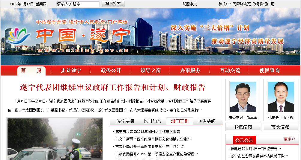 遂宁市位于四川盆地中部,涪江中游,是成渝经济区和成都平原经济区的重要组成部分。辖船山、安居“两区”和射洪、蓬溪、大英“三县”,以及国家级经济技术开发区、河东新区两个独立核算园区,105个乡镇、18个街道办事处。幅员面积5325平方公里,总人口380万。遂宁历史悠久、人文荟萃。遂宁于1985年建市,其作为地名始于东晋大将桓温平蜀后,寓意“平息战乱,达到安宁”。孕育了陈子昂、王灼、黄娥、张鹏翮、张问陶等一批英才俊杰,有“东川巨邑”“川中重镇”“文贤之邦”的美誉。遂宁物产丰富、资源富集。境内发现并利用的生物资源约1500多个品种,其中植物资源1000余种,农作物栽培品种367个,是四川省重要的粮食、油料、生猪、水果、中药材生产基地。石油、天然气、盐卤等资源储量丰富。安居磨溪天然气田探明地质储量4363亿立方米,是目前我国发现的最大单个、单层整装气藏。盐卤储量400亿吨,开发前景良好。遂宁风光秀丽、环境优美。遂宁属典型丘陵地区,海拔215-674米。涪江纵贯全境、穿城而过,在中心城区形成14.8平方公里(远期将达30平方公里)的观音湖水面,构成城在水中、水在城中的独特景观。成功创建全球绿色城市、国际花园城市、国家卫生城市、全国文明城市等20余张城市名片,被评为中国十佳宜居城市,是西部唯一的国家首批海绵城市建设试点地级市。遂宁区位独特、交通便利。遂宁是成渝间重要的节点城市和综合交通枢纽,已建成铁路“3向7线”243公里、高速公路“1环8射”359公里,实现了东西南北四向高速连接,形成了成遂渝高速中轴线、成渝经济区高速公路北环线和76公里绕城高速环线,构建了至成渝及周边城市90分钟交通圈。遂宁安居机场加快建设。遂宁海关通关运行,正在申建综合保税区和国际陆港城市。遂宁经济繁荣、社会和谐。近年来,遂宁市认真贯彻中央“四个全面”战略布局和省委“一干多支”发展战略,争先奋进、务实前行,经济社会保持平稳健康较快发展。全市形成了机械装备制造、电子信息、锂电新材料、精细化工四大成长型产业和现代物流、文化旅游等重点服务业,农产品区域公用品牌“遂宁鲜”走向全国,国家级遂宁经济技术开发区、中国西部现代物流港、五大现代农业园区建设快速推进。全面深化改革多点突破、蹄疾步稳,法治遂宁建设深入推进,荣获全国社会治安综合治理工作最高奖项“长安杯”。2017年,全市地区生产总值实现1138.06亿元、增长8.3%,一般公共预算收入60.18亿元、增长13.8%,规模以上工业增加值增速9.7%,全社会固定资产投资1257.63亿元、增长11.7%,社会消费品零售总额526.97亿元、增长12.0%,城镇居民人均可支配收入达29308元、增长8.7%,农村居民人均可支配收入达13579元、增长9.3%。2018年一季度,实现地区生产总值240.55亿元、增长9.6%,规模以上工业增加值增长9.8%,全社会固定资产投资244.83亿元、增长14.8%,社会消费品零售总额127.77亿元、增长12.7%,地方一般公共预算收入23.97亿元、增长18.9%,城镇居民人均可支配收入7852元、增长8.9%,农村居民人均可支配收入达3687元、增长9.3%。2018年上半年,预计地区生产总值增长9.0%、规模以上工业增加值增长9.9%、社会消费品零售总额增长11.8%、固定资产投资增长13.3%、城乡居民收入分别增长8.8%和9.2%,一般公共预算收入增长18.5%,圆满实现“双过半”。