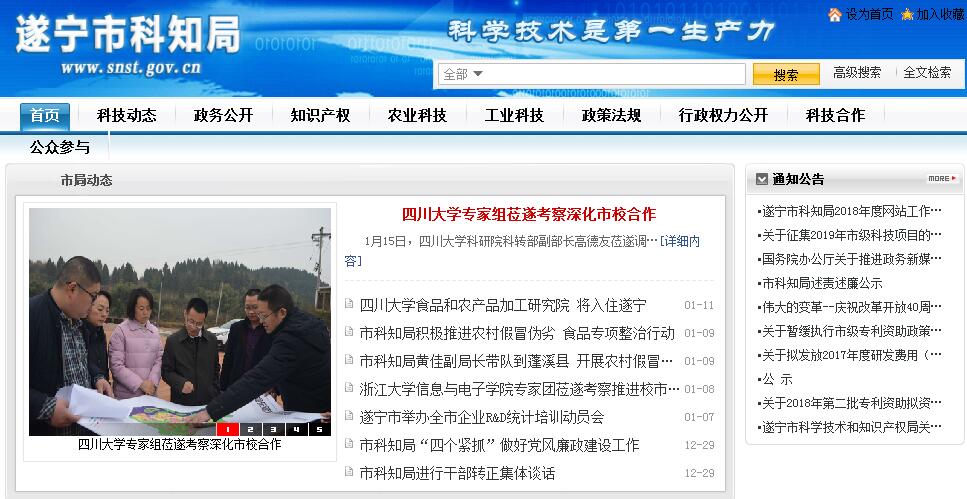 遂宁市科学技术和知识产权局主要职责:(一)拟订我市贯彻执行国、省有关科技和知识产权发展的方针、政策及法律、法规的实施方案,并组织实施和监督检查;承担科技创新体系建设工作;编制本市科技和专利工作长期发展规划和年度计划,拟订专利工作的管理办法,统筹协调全市知识产权有关事宜。(二)负责科技攻关、应用基础研究、软科学研究、“星火计划”、“火炬计划”、成果推广、新产品试制和社会发展等科技计划的拟订与实施。(三)会同有关部门拟订市级“应用技术研究与开发经费”和科学事业费、科技普及经费及其它科技专项经费的管理办法,并负责预、决算编制;配合有关部门运用财政、信贷、税收等经济手段,实施对科技工作的宏观调控。(四)拟订科技创新工程计划并组织实施;组织重大科技攻关工作;推进高新技术产业和应用技术的开发与推广工作;负责市级高新技术企业、高新技术和农业科技园区、高新技术新产品的管理工作;指导企业建立科研机构。(五)拟订科技成果转化的规划、计划;归口管理科技成果评审、奖励、保密和技术市场工作;负责科学技术成果的引进、消化、吸收;承担国、省科技部门项目课题管理;组织拟定科普工作规划,指导科技宣传工作;组织科技和知识产权方面的法律、法规的宣传普及、教育培训工作。(六)承担市政府市校合作的日常工作,开展对外科技交流与合作,会同有关部门抓好产学研创新联盟。(七)会同有关部门对县(区)和企事业单位领导班子抓第一生产力目标责任制的考核工作;负责局机关公务员和直属事业单位的干部职工管理,指导全市科技管理干部的教育、培训工作。(八)管理全市专利技术市场、专利中介等服务机构、许可证贸易和技术进出口中的专利工作;依法处理专利纠纷案件和查处假冒专利行为,指导、规范专利行政执法;承办遂宁市知识产权联席会议的有关事宜,协调全市知识产权保护工作。(九)指导企、事业单位的专利工作;制订专利技术开发与实施转化的政策措施,推动专利技术产业化;管理专利许可合同的认定、登记工作;负责专利技术专项资金的使用。(十)承担市科技领导小组、市科技顾问团、市科普联席会议协调小组交办的有关工作。(十一)承办市政府及省科技厅、省知识产权局交办的其它事项。