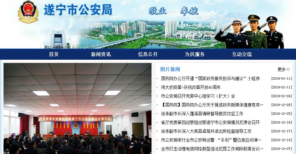 遂宁市公安局主要职责:(一)贯彻执行国家公安工作的方针、政策和法律、法规、规章,部署、指导、监督、检查全市公安工作;负责本系统、本部门依法行政工作,落实行政执法责任制。(二)指导、协调全市公安机关应急管理、抢险救援工作和社会公共突发事件的处置工作。(三)组织指导全市公安机关侦查工作,协调处理或直接侦办全市重大刑事犯罪案件及重大经济犯罪案件。(四)负责全市治安管理工作并承担相应责任。协调处置全市重大治安事故和群体性事件,指导、监督全市公安机关依法查处破坏社会治安秩序行为,依法开展治安行政管理工作,指导、监督全市公安机关治安保卫工作。(五)负责全市出入境管理有关工作。依法管理国籍、口岸边防检查工作,组织、指导全市出境、入境和持普通护照的外国人在遂居留、旅行的有关管理工作。(六)负责全市消防工作并承担相应责任。指导、监督、协调全市消防监督、火灾预防、火灾扑救工作。(七)负责全市道路交通安全管理工作并承担相应责任。指导、监督全市公安机关维护道路交通安全、道路交通秩序以及开展机动车辆(不含拖拉机)、驾驶人管理工作。(八)指导、监督全市公安机关对公共信息网络的安全保护工作,负责信息安全等级保护工作的监督、检查、指导。(九)组织、指导、协调对恐怖活动的情报、防范、侦察和应急处置工作。(十)指导、监督全市公安机关依法承担的执行刑罚和监督、考察工作,指导、监督全市公安机关看守所、拘留所、强制隔离戒毒所、收容教育所、戒毒康复中心的管理工作,指导、监督、办理收容教养审批工作。(十一)指导全市公安警卫业务工作,组织实施对有关的党和国家领导人以及重要外宾在遂的安全警卫工作并承担相应责任。(十二)组织实施全市公安科学技术工作,组织、指导、规划全市公安机关的指挥系统、信息技术、刑事技术建设。(十三)拟订全市公安机关装备、被装和经费等警务保障计划和管理制度,组织协调全市公安机关重大任务的警务保障工作。(十四)领导全市消防建设,对武警遂宁支队执行公安任务及相关业务建设实施领导和指挥。(十五)指导全市公安队伍建设和公安机关党风廉政建设,组织、指导全市公安机关人事管理、民警教育训练和宣传工作,按规定权限管理干部,拟订全市公安队伍监督管理工作规章制度,组织、指导全市公安机关督察、审计、信访工作,指导、监督全市公安机关及人民警察的执法活动,按规定权限实施对干部的监督,查处或督办公安队伍重大违纪案件。(十六)指导市内铁路、交通、民航、森林等专门公安机关的业务工作。(十七)承担市政府禁毒委员会、反恐怖工作协调小组的具体工作。(十八)承担市政府公布的有关行政审批事项。(十九)承办市政府和公安厅交办的其他事项。