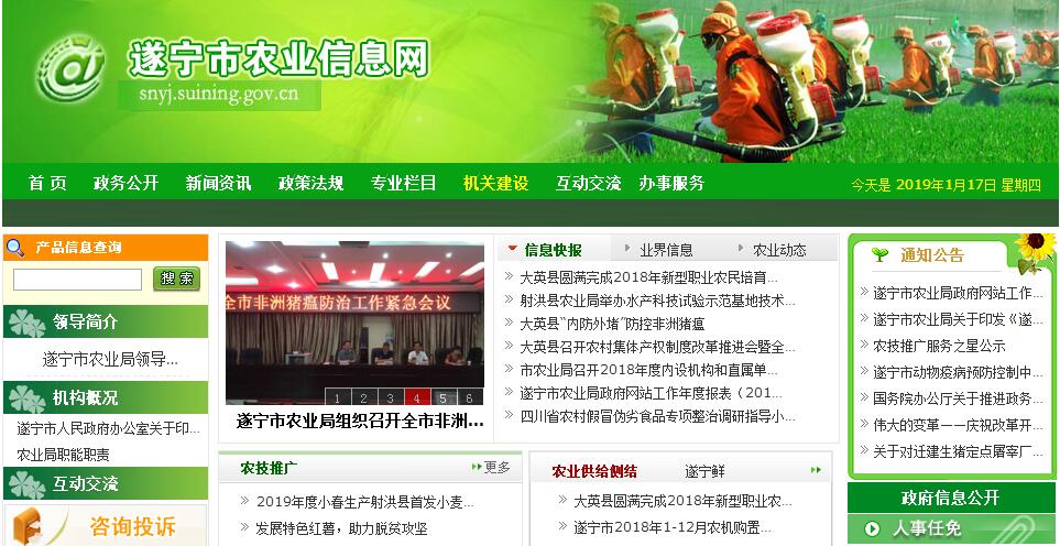 根据《中共遂宁市委、遂宁市人民政府关于印发<遂宁市人民政府职能转变和机构改革方案>和<遂宁市人民政府职能转变和机构改革方案的实施意见>的通知》(遂委发〔2014〕15号),设立遂宁市农业局(简称市农业局),为市政府工作部门。按照中共遂宁市委机构编制委员会《关于整合市畜牧食品局行政管理职责有关机构编制事项的通知》(遂编发〔2015〕55号),决定将畜牧食品局承担的行政管理职责划入市农业局。其主要职责:(一)贯彻执行党和国家有关种植业、畜牧业、渔业、农业机械化、农村能源等农业领域(以下简称农业)工作的法律、法规与方针、政策以及市委、市政府关于农业方面的决策部署,拟订全市农业和农村经济发展战略、中长期发展规划、政策并组织实施,组织起草有关农业和农村经济的地方性法规、规章草案,参与拟订涉农财税、价格、金融保险等政策,提出农业产业保护的政策建议,推进农业依法行政。(二)承担完善农村经营管理体制的责任,提出深化农村经济体制改革和稳定完善农村基本经营制度的政策建议,指导农村土地承包、耕地使用权流转和承包纠纷仲裁管理;指导、监督减轻农民负担和村民筹资筹劳管理工作,指导农村集体资产和财务管理;拟订农业产业化经营的发展规划与政策并组织实施,指导、扶持农业社会化服务体系、农村合作经济组织、农民合作社建设与发展。(三)指导粮油、果蔬、畜禽、水产等主要农产品生产工作,组织落实促进粮油、畜禽、水产等主要农产品生产发展的相关政策措施,引导农业产业结构调整和产品品质的改善;会同有关部门指导农业标准化、规模化生产,拟订农业开发规划并监督实施,编报部门预算并组织执行,提出扶持农业农村发展的财政政策和项目建议。(四)指导农业产业化经营,促进农业产前、产中、产后一体化发展;组织拟订优势特色效益农业发展、现代农业产业基地建设等政策与规划并组织实施,提出主要农产品营销政策建议,研究制订大宗农产品市场体系建设与发展规划,培育、保护和发展农产品品牌;负责指导全市休闲农业发展;负责生猪屠宰管理;组织协调“菜篮子”工程有关工作。(五)承担提升农产品质量安全水平的责任;组织开展全市农产品质量安全的监督管理,组织拟订农产品质量地方标准并会同有关部门组织实施和监督管理,负责农产品质量安全监测,依法开展市级农产品质量安全风险评估和质量追溯,指导农业检验检测体系建设和机构考核,依法组织实施符合安全标准的农产品生产基地认定、产品认证、农产品地理标志登记保护和监督管理。(六)组织开展农业生产资料市场体系建设,承担农作物种子(种苗)、食用菌种、蚕种、草种、种畜禽、水产种苗、农药、兽药(渔药、蚕药)、饲料、饲料添加剂等农业生产资料的许可及监督管理职责,监督管理兽医医疗器械、肥料;会同有关部门监督实施农业生产资料国家标准,拟订有关农业生产资料地方标准并会同有关部门监督实施,参与农资市场秩序的整顿、规范和农资打假工作;承担渔政、渔港、渔船、渔机、网具的监督管理职责。(七)负责制定全市农业机械化发展规划并组织实施;引进、示范和推广农业机械新技术、新机具,指导全市农业机械化基础设施建设的规划、建设和技术工作,指导农村机电提灌、机耕道建设,承担农业机械化使用安全监管职责。(八)负责农作物重大病虫害的防治;会同有关部门制定动植物防疫检疫政策并指导实施;指导动植物防疫检疫体系建设,组织、监督对市内动植物的防疫检疫工作,监测发布疫情并组织扑灭;组织植物检疫性有害生物普查;牵头管理外来农业物种;组织兽医医政和兽药药政、药检工作。(九)承担农业防灾减灾责任,监测、核查、发布农业灾情,组织种子、种苗、化肥、农药、兽药(渔药、蚕药)等农业生产救灾物资的储备和调拨,提出生产救灾资金安排建议,指导农业抗灾救灾和灾后生产恢复。(十)管理农业和农村经济信息,监测分析农业和农村经济运行,开展相关农业统计工作;指导农业信息体系建设,发布农业和农村经济信息,指导农业信息服务。(十一)制定全市农业科研、农技推广的规划、计划和有关政策并组织实施,会同有关部门组织市级农业科技创新体系、农业产业技术体系建设;组织农作物、畜禽、水产养殖等新品种育种攻关和农业先进技术引进、试验、示范,组织实施农业领域的高新技术和应用技术研究、科技成果转化和技术推广,负责农业科技成果管理,指导农技推广体系改革与建设;负责农业植物新品种保护和农业转基因生物的安全监督管理。(十二)负责农业资源区划和资源保护工作,指导农用地、渔业水域以及农业生物物种资源的保护和管理,负责水生野生动植物保护工作;依法管理耕地质量,拟订耕地及基本农田质量保护与改良政策并指导实施;运用工程设施、农艺、农机、生物等措施发展资源节约型、环境友好型农业。(十三)负责农村能源建设和资源环境工作,制定并组织实施农业资源环境建设规划,指导农村可再生能源综合开发与利用,指导农业生物质产业发展和农业农村节能减排,承担指导农业面源污染防治工作;提出划定农产品禁止生产区域的政策建议,指导生态农业、循环农业等发展;会同有关部门保护渔业水域生态环境。(十四)会同有关部门拟订全市农业农村人才队