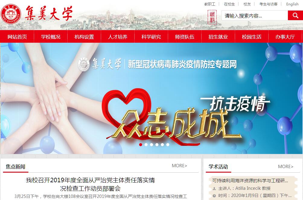 集美大学地处福建省厦门市,是福建省重点建设高校,是交通运输部与福建省、国家海洋局与福建省、福建省与厦门市共建高校,博士学位授予单位,硕士推免生资格单位,面向全国招生。学校办学始于著名爱国华侨领袖陈嘉庚先生1918年创办的集美学校师范部和1920年创办的集美学校水产科、商科,迄今已有近百年历史。1994年,集美师范高等专科学校、集美航海学院、集美财经高等专科学校、厦门水产学院、福建体育学院合并组建集美大学。学校以“诚毅”为校训,在长期办学实践中坚持“嘉庚精神立校,诚毅品格树人”,在海内外享有广泛声誉。学校现有21个学院,69个本科专业,涵盖经济学、法学、教育学、文学、理学、工学、农学、管理学及艺术学等9个学科门类,基本形成了经济、法、教育、文、理、工、农、管理、艺术等综合性的专业结构体系。有8个福建省一级重点学科(其中2个特色重点学科),1个水产学科博士后科研流动站;水产、船舶与海洋工程等2个一级学科博士点;水产、船舶与海洋工程、食品科学与工程、交通运输工程、应用经济学、体育学、数学、中国语言文学、生物学、机械工程、信息与通信工程、工商管理、设计学等13个硕士学位授权一级学科点;农业、工程、教育、税务、会计、体育、艺术、社会工作等8个硕士专业学位类别。船舶与海洋工程学科群、水产与食品工程学科群入选福建省高峰学科,航运与港口物流学科群、区域经济与管理学科群、闽台体育文化学科群、数理学科群入选福建省高原学科。学校现有专任教师1500余人,高级职称教师800余人。现有双聘院士2人,国家“百千万人才工程”人选1人,享受国务院政府特殊津贴专家5人,省引才“百人计划”人选1人,省科技创新领军人才2人,省哲学社会科学领军人才1人,闽江学者特聘教授3人、讲座教授9人,省杰出科技人才2人,省优秀人才1人,省“百千万人才工程”人选11人,省企事业人才高地领军人才1人,省高校科技创新团队带头人4人,省青年科技奖获得者1人,省高等学校教学名师3人,省高校思想政治理论课学科带头人2人,省引进高层次人才2人,省引进台湾人才3人,交通运输部交通运输青年科技英才2人,农业部现代农业产业技术体系岗位科学家5人,交通运输行业高层次技术人才培养项目1人,省高等学校新世纪优秀人才支持计划人选33人,省高校杰出青年科研人才培育计划人选39人,省高等学校思想政治教育中青年杰出人才支持计划1人,市双百人才4人,市拔尖人才9人,市台湾特聘专家1人,省企事业人才高地1个。福建省高校科技创新团队5个。学校现有在校生27000余人,其中全日制本科生25600余人、各类研究生1400余人,各类留学生近600人。学校拥有3个国家级专业综合改革试点项目,6个国家级“卓越”人才培养计划专业,4个国家级特色专业、1个国家级教学团队、2个国家级实验教学示范中心、1个国家级虚拟仿真实验教学中心、1个国家级大学生校外实践教育基地,省级特色专业建设点和省级专业综合改革试点各11个,省服务产业特色专业8个,省创新创业教育改革试点专业6个,省级教学团队7个,省级实验教学示范中心16个,省级虚拟仿真实验教学中心2个。学生在全国大学生“挑战杯”、数学建模、机器人、智能汽车大赛,以及全国运动会、全国学生运动会等重大赛事中屡创佳绩。毕业生得到社会广泛好评,近三年,就业率保持在95%以上。在长期办学过程中,学校形成了航海、水产等面向海洋的学科专业特色和优势,航海教育在国内外有较大影响,是我国培养高级航海人才的重要基地,学校的教学实习船“育德”轮总载重达6.4万吨,是目前世界上最大的教学实习船。学校现有2个国家地方联合工程研究中心,13个省(部)级科研创新平台和人文社科研究基地,1个省级高校特色新型智库,13个省级高校创新平台/研究基地。先后承担了一批国家973、国家863、国家自然科学基金、国家社会科学基金等国家级课题的研究任务,研究成果获省部级及以上科技奖励40余项。学校积极开展协同创新,牵头组建“福建省游艇产业关键技术协同创新中心”,参与创建“福建省海洋生物资源开发利用协同创新中心”,与企事业单位共建各类研发平台近50个。学校积极开展对外交流与合作,充分发挥面向东南亚、毗邻台港澳等区位优势,服务国家“一带一路”倡议。学校已与美国、英国、澳大利亚等国家和港澳台地区的100多所高校、科研机构及国际海事组织(IMO)、国际航标协会(IALA)、国际海事大学联合会(IAMU)等开展学术交流与合作。学校与教育部(中国)留学服务中心开展战略合作,共建出国留学培训基地;是福建省较早举办中外合作办学项目及闽台联合培养人才项目,较早具备招收留学生和港澳台、华侨学生资格的院校;是教育部授权对港免试招生院校和对台湾学生单独招生院校之一;是厦门市“海丝”国家留学生“陈嘉庚奖学金”招生院校之一,是交通部海事局批准大陆唯一具有开展台湾船员无限航区海船船员适任培训和履约过渡期适任培训资格的院校;是香港特区政府“青年内地交流计划”福建省唯一资助单位。作为国家汉办支持周边国家汉语教学的主要院校和福建省首批“海外华文教育基地”,自2007年起,每年向菲律宾、泰国、印尼等“一带一路”沿线国家派出汉语教师志愿者。学校占地面积2300多亩,校舍面积近100万平