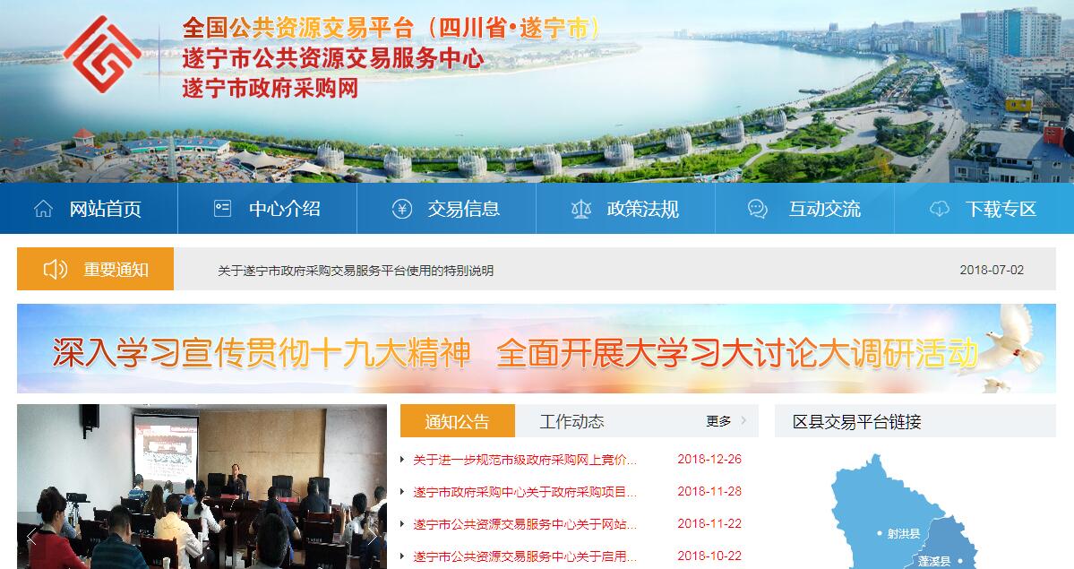 2007年7月1日,遂宁市建设局原下属的市建设工程交易中心移交给市政务服务中心管理,更名为“遂宁市国家投资工程建设交易中心”,承担全市国家投资建设工程的交易职能。2012年12月21日,市编委会正式批复设立“遂宁市公共资源交易服务中心”,为政务服务中心管理的正县级事业单位。2013年12月,市委6届66次常委会通过,市编委批准市公共资源交易服务中心为市政府直属正县级事业单位,内设综合服务科、政府采购服务科、工程交易服务科、产权交易服务科4个职能科室。2014年3月,市公共资源交易服务中心与政务服务中心剥离,独立运行。2016年6月,按照全省推进公共资源交易平台整合工作要求,市政府出台文件,撤销县(区)公共资源交易服务中心,县(区)统一设置为市公共资源交易中心的分中心。2018年6月建立全市统一的公共资源交易平台和电子化交易系统市交易中心坚持应尽必进的原则,全市工程建设、政府采购、产权交易、国有建设用地、政府特许经营权等5大类41项公共资源交易项目全部纳入交易中心集中规范交易。近年来,市交易中心按照“制度保障,科技支撑,阳光交易”的工作思路,在探索中前进,在创新中发展,建成公共资源交易信息服务平台、网上交易平台、网上监督平台,实现了公共资源网上交易、实时监控。同时按照“职能流程化,信息碎片化、权力分散化”的要求,不断完善制度规则,规范交易流程,强化监督管理,“统一规范、竞争有序、公开透明”的交易环境逐步建立。