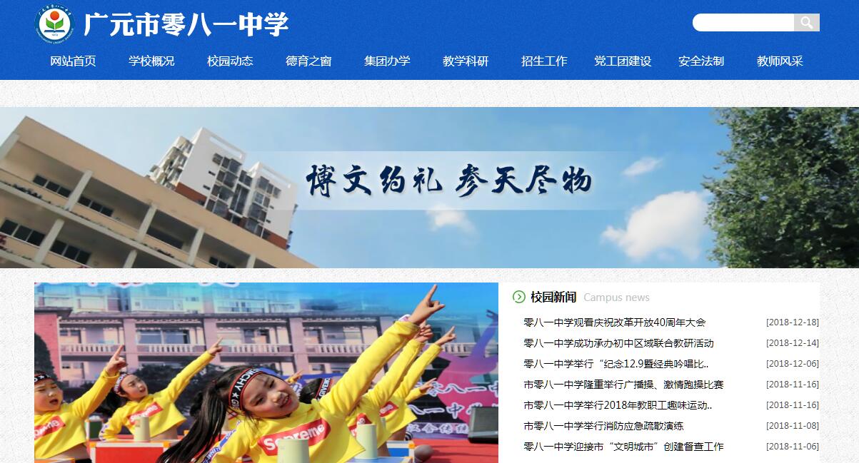四十年的光荣与梦想,四十年的奋斗与追求。这里是一方沃土,孕育了无数花朵,成长着万千树苗;这里是一方大地,撒满阳光,把希望的种子播撒。这是一首奋进的歌,朝气蓬勃,欣欣向荣。这是一艘启锚扬帆的航船,满载莘莘学子,驶向知识的海洋。 这更是一只展翅的雄鹰,翱翔蓝天,展望未来。闹市中的净土——广元市零八一中学。广元市零八一中学,前身是1968年国有大中型军工企业零八一电子集团创建的零八一子弟中学,2004年,在企业改制的大潮中,回归地方管理,更名为广元市零八一中学。2014年,在广元市教育局的战略布局中,和广元中学结成教育集团。秉承企业人开拓创新,求真务实的精神,学校已形成了独具特色的校园文化。学校以“尊重教育”为办学理念,以争创省内名校为办学目标,脚踏实地走好每一步。广元市零八一中学是一所教学设施完备、教育特色鲜明的九年一贯制学校,广元市教育局直属管理。现有40多个教学班,在校学生近2000人,教职员工116人,获市级优秀班主任、先进教师、教坛新秀和骨干教师等荣誉称号教师共30余人。教师年富力强,敬业爱岗。学校优雅的环境,高水平的师资队伍,科学的教育、教学管理,为全面提高学生素质创造了良好的条件。近年来,学校抓住机遇,在各级党委、政府、社会各界人士的悉心关怀下,积极筹措资金,大规模进行学校建设。学校先后建成校园远程教育接收系统、校园广播系统等现代信息技术系统;标准的运动场、崭新的住宿楼可满足上千人运动、住宿的需求。德育、教学成绩显著,先后被共青团中央、教育部、全国少工委评为“全国优秀少先队集体”荣誉称号。被共青团四川省委评为“五四红旗团委”。被四川省教科所评为“信息化和课堂教学融合”示范学校。在一代代零八一中学人的奋力拼搏下,学校已成为众多学子带着圆梦情结抒写人生传奇的神圣殿堂。
