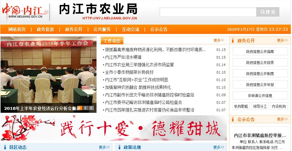 内江市农业局主要职责:(一)贯彻执行党和国家有关种植业、畜牧业、渔业、农业机械化、农垦等农业领域(以下简称农业)工作的法律、法规与方针、政策,拟订全市农业和农村经济发展战略、中长期发展规划、政策并组织实施,组织起草有关农业和农村经济的地方性政策,参与拟订涉农财税、价格、金融保险等政策,提出农业产业保护的政策建议,推进农业依法行政。(二)承担完善农村经营管理体制的责任。提出深化农村经济体制改革和稳定完善农村基本经营制度的政策建议,指导农村土地承包、耕地使用权流转和承包纠纷仲裁管理。指导、监督减轻农民负担和村民筹资筹劳管理工作,指导农村集体资产和财务管理。拟定农业产业化经营的发展规划与政策并组织实施,指导、扶持农业社会化服务体系、农村合作经济组织、农民专业合作社和农产品行业协会的建设与发展。(三)指导粮油、畜禽、水产等主要农产品生产工作,组织落实促进粮油、畜禽、水产等主要农产品生产发展的相关政策措施,引导农业产业结构调整和产品品质的改善。会同有关部门指导农业标准化、规模化生产。负责市级涉农财政性资金安排的建议意见,编报部门预算并组织执行,提出扶持农业农村发展的财政政策和项目建议,经批准后与财政部门共同制定实施方案并指导实施。拟订农业开发规划并监督实施。配合市级财政部门组织实施农业综合开发有关项目。参与组织实施种粮农民补贴、畜牧水产良种补贴、农资产品补贴和政策性农业保险工作。(四)指导农业产业化经营,促进农业产前、产中、产后一体化发展。组织拟定优势特色效益农业发展、现代农业产业基地建设等政策与规划并组织实施,研究制定大宗农产品市场体系建设与发展规划,培育、保护和发展农产品品牌。负责指导全市休闲农业发展;负责生猪屠宰管理;组织协调“菜篮子”工程有关工作。(五)承担提升农产品质量安全水平的责任。组织开展全市农产品质量安全的监督管理,负责农产品质量安全监测,依法开展市级农产品质量安全风险评估,报送有关农产品质量安全状况信息,指导农业检验检测体系建设和机构考核,依法组织实施符合安全标准的农产品生产基地认定、产品认证、农产品地理标志登记保护和监督管理。(六)组织、协调农业生产资料市场体系建设。依法实施农作物种子(种苗)、食用菌种、蚕种、种畜禽、水产种苗、农药、兽药(渔药)、饲料、农用膜、饲料添加剂等农业生产资料的许可及监督管理,监督管理兽医医疗器械、肥料。会同有关部门监督实施农业生产资料国家标准,参与农资市场秩序的整顿、规范和农资打假工作,依法开展农业综合执法。承担渔政、渔港、渔船、渔机、网具的监督管理职责。(七)负责制定全市农业机械化发展规划并组织实施。承担推广先进适用的农业机械化新技术、新机械并组织生产作业,指导农村机电提灌、机耕道建设,承担负责农业机械使用安全监管的责任,参与农机产品政策性补贴工作。(八)负责农作物重大病虫害、重大动物疫病防治。会同有关部门制定动植物防疫检疫政策并指导实施,指导动植物防疫检疫体系建设,组织、监督对市内动植物的防疫检疫工作,监测疫情并组织扑灭,组织动植物检疫性有害生物普查,承担引进农作物种子(种苗)检疫审批的有关工作,牵头管理外来物种。组织兽医医政和兽药药政药检工作。(九)承担农业防灾减灾责任。监测农业灾情,组织种子、种苗、化肥、兽药(渔药)等救灾物资的储备和调拨,提出生产救灾资金安排建议,指导紧急救灾和灾后生产恢复。(十)管理农业和农村经济信息,监测分析农业和农村经济运行。开展相关农业统计工作,负责农业信息体系建设,指导农业信息服务。(十一)制定全市农业科研、农技推广的规划、计划和政策并组织实施,会同有关部门组织市级农业科技创新体系、农业产业技术体系建设。组织农作物、畜禽、水产养殖等新品种育种攻关和农业先进技术引进、试验、示范,组织实施农业领域的高新技术和应用技术研究、农业科技成果转化和技术推广,负责农业科技成果管理,指导农技推广体系改革与建设,负责农业动植物新品种保护、农业转基因生物的安全监督管理。(十二)负责农业资源区划和资源保护工作。指导农用地、渔业水域、宜农滩涂、宜农湿地以及农业生物物种资源的保护和管理,负责水生野生动植物保护工作。制定耕地及基本农田质量保护与改良政策并指导实施,依法管理耕地质量,运用工程设施、农艺、农机、生物等措施发展资源节约型、环境友好型农业。(十三)负责农村能源建设和资源环境工作。制定并组织实施农业资源环境建设规划,指导农村可再生能源综合开发与利用,指导农业生物质产业发展和农业农村节能减排,承担指导农业面源污染防治有关工作。提出划定农产品禁止生产区域的政策建议,指导生态农业、循环农业、休闲农业等发展。会同有关部门保护渔业水域生态环境。负责城镇沼气的开发,对城镇沼气池设计、建设、运行实施管理。(十四)会同有关部门拟订全市农业农村人才队伍建设规划并组织实施,指导农业职业教育和农业职业技能开发工作,参与实施农村实用人才培训工程。承担农民科技培训和农村劳动力转移就业培训工作,会同有关部门依法实施农业农村人才专