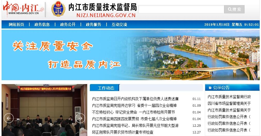 内江市质量技术监督局主要职责:(一)贯彻执行国家和省有关质量技术监督工作的方针、政策和法律、法规。(二)承担管理和指导全市质量工作的职责;组织实施国务院质量发展纲要;负责拟定提高全市质量发展水平的发展战略规划;组织实施品牌战略;组织品牌产品创建工作;组织实施质量奖励制度,负责建立全市产品质量诚信制度;研究分析全市质量形势,发布质量信息。(三)承担管理全市标准化工作的职责;组织实施标准化战略,贯彻国家标准化法律法规和方针政策;负责区域性地方标准的统一立项、制修订和发布工作;负责管理采标和企业产品标准备案工作;组织实施标准并对标准实施情况进行监督检查;指导协调有关行政主管部门和行业组织开展标准化工作;管理全市商品编码工作。(四)承担管理全市计量工作的职责。负责建立和管理市级及以下社会公用计量标准和部门、企(事)业单位最高计量标准;组织推行法定计量单位和国家计量管理制度;建立全市量值传递和量值溯源体系;监督管理商品量、过度包装、市场计量行为、计量仲裁、计量检定机构及计量检定人员的资质资格;负责区域内能源计量监督管理和能效标识检查工作。(五)承担管理全市认证认可工作的职责;监督管理全市认证认可活动;依法开展全市实验室资质认定监督检查工作;负责强制性认证产品、自愿性认证企业和食品农产品认证的监督工作;负责全市认证证书和认证标志的监督检查工作。(六)承担产品质量监督工作的职责;组织实施本区域质量监督抽查工作;组织对重点产(商)品质量实施监督;负责产品质量事故的调查;负责产品质量的申诉处理;监督管理工业产品生产许可证工作;组织实施缺陷产品召回制度;负责纤维及制品质量监督检查工作;负责机动车安全检验机构的监督管理工作。(七)负责食品包装材料、容器、食品生产经营工具等食品相关产品生产加工的监管。(八)负责对全市特种设备安全监督管理工作。负责特种设备安全宣传教育,贯彻实施特种设备安全管理相关的法律、法规、规章;监督检查高耗能特种设备节能标准执行情况。(九)组织协调并查处生产领域质量违法行为;指导管理本行政区域内质量技术监督行政执法工作;查处违反质量、标准、计量、认证认可、特种设备安全等法律、法规的违法行为;组织开展打击假冒伪劣活动;负责市质量技术监督投诉、申诉和举报工作;承办上级质监部门交办、督办案件的查处工作;负责跨区域质量案件的协调和查处工作。(十)负责组织协调行业和专业的质量技术监督工作;制定并组织实施质量技术监督事业发展规划和技术机构建设规划。(十一)承担市政府公布的有关行政审批事项;负责组织机构代码管理工作。(十二)配合实施相关专业职业资格审查和管理工作。(十三)承办市政府交办的其他事项。