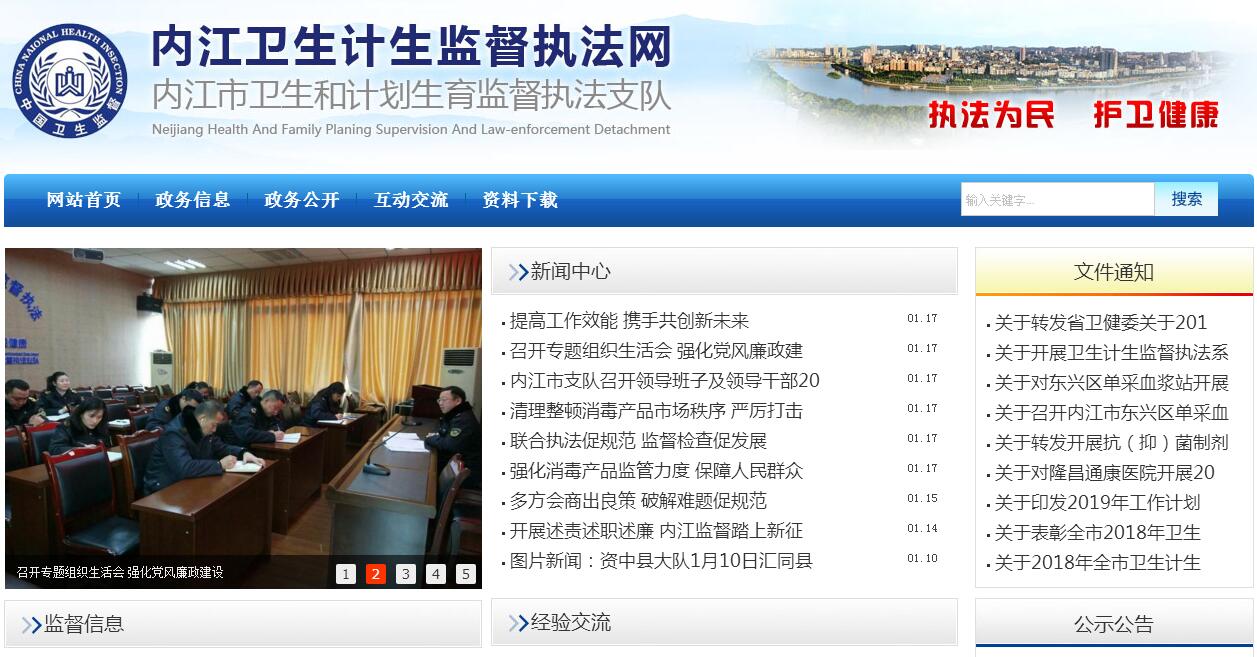 内江市卫生和计划生育监督执法支队是根据中共中央、国务院《关于卫生改革与发展的决定》和原卫生部《关于卫生监督体制改革的意见》精神,结合内江实际,经中共内江市委编委批准成立、更名(2015年)的卫生计生监督执法机构,同时也是在市卫生计生委(原市卫生局)领导下,依据国家和地方卫生法律法规履行卫生计生监督执法职责的执行机构,承担全市宣传贯彻卫生计生法律法规、综合卫生计生监督执法和监督、指导下级卫生计生监督执法的任务。内江市卫生和计划生育监督执法支队依据政事分开、依法行政,统一模式、综合管理的要求,本着精简、效能、统一的原则,将有关的卫生计生监督职能相对集中,承担面向社会的综合卫生计生监督执法任务。支队下设5个科(室),设有编制人员17名,聘用卫生计生监督执法协管人员9名,依法承担对公共卫生、医疗卫生、中医药服务、计划生育、保健机构(含采供血机构)、卫生许可、执业许可、医疗广告以及重大疫情和突发事件等综合性卫生计生监督执法工作。卫生计生综合监督行政执法工作是卫生计生工作的重要组成部分,是实现国家卫生计生管理的重要手段,是执行国家卫生计生法律法规、维护卫生计生秩序、促进经济社会协调发展、建设健康中国的重要保证,具有较强的专业性、技术性。内江市卫生和计划生育监督执法支队的基本任务是保障市场经济和各种社会活动中的正常卫生计生秩序,预防和控制疾病的发生与流行,保护公民的健康权益。在履行卫生计生监督执法任务中,我支队将凭借现代化科学技术和管理优势,加强内部管理,造就一支政治素质高、业务能力强、廉洁自律、秉公执法和办事高效的监督执法队伍,树立良好的卫生计生行政执法形象,严格执法、热情服务,为促进我市社会、经济健康、稳步发展做出应有的贡献。
