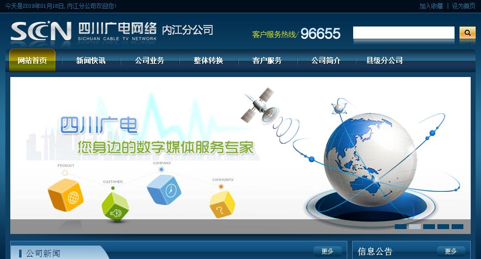 2010年12月实现省、市、县(区)广电网络整合,成立四川省有线广播电视网络股份有限公司内江分公司(简称四川广电网络内江分公司),人财物受省公司直管,同时接受当地行业主管部门监管,并受省公司委托管隆昌县、威远县、资中县、东兴区4个县(区)级分公司。市本级分公司,目前正对前端机房进行技术改造,750兆前端网络传输系统覆盖用户范围,主要包括市中区城区(含郊区)6街1乡1镇及其区辖农村12个乡(镇)、东兴区城区(含郊区)3街1镇,实现了与东兴区、资中县、威远县、隆昌县的光纤干线联网,并正加快市到各县(区)城域环网建设。目前,采用对用户的分段可寻址收费管理系统、数据平台和能传输100套以上数字电视节目的DVB-C前端系统。目前市本级全网用户总数约12万户,实际用户约11万户,其中含模拟电视用户7万多户和数字电视用户3万多户。随着数电整转步伐加快,所有用户都将转换模拟电视为数字电视。市本级分公司内设机构包括:综合部、人力资源部、财物资产部、市场营销部、运行维护部、客户服务部、工程技术部和城郊营业部、白马营业部、永安营业部、凌家营业部、史家营业部共7个部门和5个营业部。分公司办公地址:内江市市中区翔龙路一巷33号;网址:www.sc96655.com/内江;邮箱:scnjgdwl@163.com;传真:0832.2023981;联系电话:0832.2050641(综合部)、0832.96655 (客户热线);邮政编码:641000。