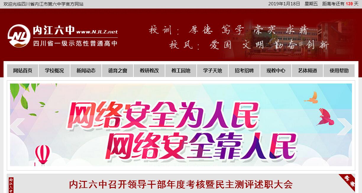 学校创办于1939年秋,1981年被四川省人民政府确定为首批省属重点中学,2002年12月经四川省国家级示范性普通高中专家组评估,被四川省教育厅确定为 “四川省国家级示范性普通高中”,2013年12月被四川省教育厅批准为“四川省一级示范性普通高中”。学校占地170亩,建筑面积6.9万平方米。现有高、初中教学班119个(其中高中72个,初中47个),在校学生7654人,住校生人数常年保持在2200人左右。有在职教职工420人,高级教师136人,中级教师140人,特级教师及特级教师后备人才、省、市级名师、市拔尖人才、市学科带头人、省、市级骨干教师88人,全国、省、市级优秀教师、先进工作者、师德标兵等80余人。形成了一支以中青年教师为主体、结构合理、师德高尚、业务素质精良的师资队伍。学校具有七十多年办学历史,有着突出的办学成绩和丰富的办学经验,培养和输送了数以万计的各种类型、各层次人才。改革开放之初,曾以培养“科大五少年”,“亚洲女飞人 ”刘晓梅,国家乒乓球队副队长陈平西等一大批富有个性特长的拔尖人才而闻名川内外,2005年,文、理科高考个人总分全省第一名同落内江六中,被誉为全国最有影响力的中学。六十年代初,学校被授予“全国红旗学校”的称号,受到国务院的嘉奖。学校现是省级校风示范校、省德育工作先进学校、全国优秀家长学校、全国培养体育后备人才试点中学、全国图书管理先进学校、全国语言文字工作先进集体、省思想政治工作先进学校、省心理健康教育示范校、省科技教育示范学校、四川省首批省级消防安全教育示范校、省交通安全示范校、内江市最佳文明单位等。连续多年六中高考成绩在内江市名列榜首。重点大学上线率,本科上线率,600分以上特优生均居省内同类学校之前列;学校连续十五年获“内江市高中教育质量先进学校”一等奖。学校在全面育人的基础上,注重发展学生个性特长。近年来,为北大、清华输送优秀毕业生63人,学生黄晓钢、王琅、邱汛、兰雪曾先后获高考文、理科个人总分全省第一名,近年来,有黄禹力、刘毅等6人被新加坡国立大学、香港中文大学全额奖学金录取。学校培养特长生成绩突出。组织指导学生参加学科竞赛成绩优异,科技创新活动成绩令人瞩目。学生参加高中数、理、化、生、信息技术奥赛获全国一、二等奖一百多人次。学生龙瑶获数学竞赛全国一等奖,特招入清华附中后被输送入冬令营。学生陈烨编制的计算机软件《带杂交算子的蚁群算法》和《一种具有良好多样性遗传算法》,曾先后在国家级学术刊物《计算机工程》和《计算机科学》上发表,获全国青少年科技发明二等奖、《明天小小科学家》全国二等奖。卜多门、雷宇、郭婧等同学的科技作品《校园废纸种菇》获全国青少年科技发明二等奖。学生余亦飞、魏爻的科创作品先后获全国一等奖,并在《中学生》杂志上发表。学生邓家佳参加东南电视台才艺表演大赛获第一名,在高中阶段就参加拍摄电视剧《侠客行》。近期电影、电视作品有:《爱情公寓》、《全民目击》、《十全九美》、《夏日示爱》、《想明白再结婚》等。学生贺准、林茂殊参加央视“三星快车”智力赛,获全国第二名。学生张劲被评为“巴蜀十佳少年”。学生曾羽被评为“全国宋庆龄奖学金”获得者,代表四川获奖者到上海领奖,曾受到原教育部陈至立部长的接见。“网络中学生作家”聂冰清被评为“全国宋庆龄奖学金”获得者。学生谢卓淼参加全国象棋大赛获第二名,被授予“棋协大师”称号,2006年晋升为“中国象棋大师”。学校为省运动队输送多名优秀运动员,学生孟洪浩输送到四川省男子排球队,并进入国家青年集训队。学生罗岚代表四川省中学生参加演讲比赛获全国一等奖,聂成旭获全国二等奖。体艺工作有特色。学校文娱演出节目多次在省、市获奖,2009年舞蹈《知道不知道》获省一等奖;学生女子排球队曾获省四青会冠军;男子排球队曾两次获省青运会冠军,蝉联省“三好杯”冠军;2010年7月学校男子排球队获省第十一届运动会亚军,学校被内江市人民政府评为突出贡献先进集体;2014年8月学校男子排球队代表内江参加四川省第十二届运动会获亚军,并为内江市代表团获得三块金牌。我校创办的“内江市树人青少年体育俱乐部”被国家体育总局授牌为国家级体育俱乐部。