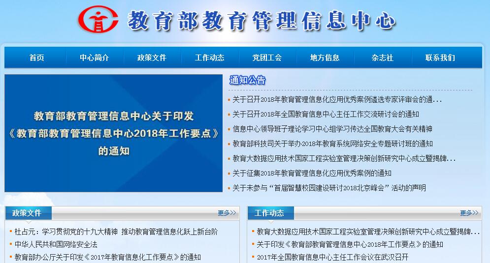 教育部教育管理信息中心(简称信息中心)成立于1987年,系教育部直属事业单位。主要职责任务是:1、收集、处理、分析国内外有关教育管理的信息,为教育部宏观管理和科学决策服务,为各级教育行政部门的管理工作服务;2、为教育部机关各司局业务管理活动提供计算机网络等现代技术环境和服务;3、组织、协调和推进国家教育管理信息系统的开发和建设,逐步建立为教育管理服务的全国教育信息网络;4、负责制定国家教育信息标准和数据交换标准;5、开展教育信息战略研究,与国内外相关教育管理信息系统进行信息交换和交流合作。信息中心为公益二类事业单位,实行主任负责制,现设主任一名,副主任二名,主任助理一名。信息中心内设10个处(室),分别是:办公室、财务处、综合处、数据处、信息化应用与发展处、网络运行处、网络信息处、网络安全处、信息系统规划处、信息化研究处。经教育部人事司批准,在我中心设立教育信息安全等级保护测评中心和教育电子认证服务中心。另外设有《中国教育信息化》杂志社,负责编辑出版《中国教育信息化》、《世界教育信息》、《基础教育参考》期刊,承办学术论坛及博览会等。信息中心还是中国教育发展战略学会教育信息化专业委员会依托单位。按照教育部统一部署和安排,信息中心现阶段所承担的核心任务是教育管理公共服务平台建设与应用和教育部机关电子政务等工作,负责国家核心业务系统的建设与应用、部机关电子政务技术支持与服务、网络信息安全技术支持与等级保护测评工作、对地方教育管理信息化工作的培训和指导服务。