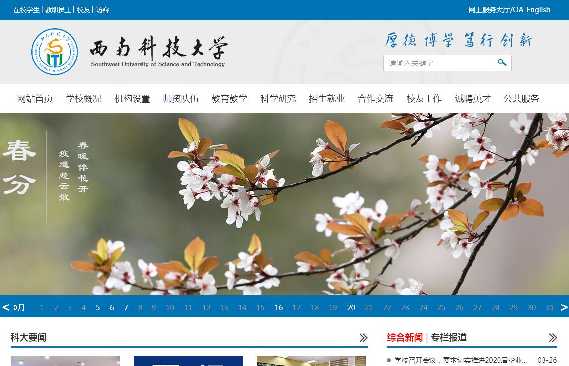 西南科技大学坐落于中国科技城——四川省绵阳市。学校是四川省人民政府与教育部共建高校,四川省人民政府与国家国防科技工业局共建高校,被教育部确定为国家重点建设的西部14所高校之一。原中央政治局常委,国务院副总理李岚清同志赞誉学校“共建与区域产学研联合办学”走出了一条有自己特色的办学路子。学校现任党委书记庄天慧、校长陈永灿。建校以来,学校几经搬迁,走过了创业、发展、壮大的不平凡历程。在深化高等教育体制改革、西部大开发和中国(绵阳)科技城建设的大背景下,2000年8月23日,教育部批准西南工学院与绵阳经济技术高等专科学校合并组建成立西南科技大学。学校校园现占地4000余亩,校园宽阔,环境优美,是读书学习的好地方。学校现有在校研究生、普通本专科学生、外国留学生3.4万余人。设有国防科技学院等17个学院(部),在工学、农学、理学、经济学、法学、文学、管理学、教育学、艺术学、医学等10大学科门类,设有本科专业78个;有一级学科硕士点22个、独立二级学科硕士点1个,有硕士专业学位类别8个;有一级学科博士点4个,博士后科研流动站1个,有4个学科方向与中国工程物理研究院等开展联合培养博士研究生。有四川省“双一流”建设学科(群)2个、省级优势学科4个、省级重点学科11个,有国防科工局批准的国防基础学科1个、国防特色学科方向5个。学校现有教职工2600余人,其中:正高级职称人员297人,副高级职称人员647人;有博士生、硕士生导师585人;有中国工程院院士1人,从董事单位等聘任院士13人;有“长江学者奖励计划”特聘教授、国家“千人计划”、“新世纪百千万人才工程”国家级人选、“教育部新世纪人才计划”人选、享受国务院政府特殊津贴专家、四川省有突出贡献的优秀专家、四川省学术和技术带头人及后备人选、“四川省千人计划”人选、四川省教学名师等120余人次。有“核废物环境下的生物效应”国家国防科技创新团队,“碳纳米材料”和“特种高分子”四川省青年科技创新团队,以及“光电检测技术与研究”等10个四川省教育厅创新团队。有“军民融合研究”四川省社会科学高水平研究团队。学校有省部共建国家重点实验室1个,国家绝缘材料工程技术研究中心(共建)1个,有国防重点学科实验室1个、教育部重点实验室2个、教育部工程研究中心1个,有四川省重点实验室3个,四川省工程实验室2个,四川省工程技术研究中心2个。有四川省协同创新中心3个、四川省军民两用技术转移和产业孵化中心等。有四川省高校重点实验室10个。有教育部“区域和国别研究基地”1个,有四川省哲学社会科学重点研究基地等省级研究平台3个、省社科普及基地2个。近年来,学校完成了多项国家重大专项、“973”、“863”计划、国家科技支撑计划、国家自然科学基金重点项目、国家重大仪器专项、国防重点项目、国家社科基金项目等,获得国家科技进步二等奖等国家级和省部级科技奖励110多项。学校有现代电子系统设计、管理学原理等国家级、省级精品课程39门,电子技术与创新、化学实验教学团等国家级和省级高校教学团队8个,机械设计制造及其自动化等7个国家级卓越人才教育培养计划专业。有材料科学与工程、自动化、环境工程等6个国家特色专业建设点,电子信息工程专业为国防重点专业,辐射防护与核安全专业为国防紧缺专业,有8个国家级、省级高校实验教学示范中心。学校创新创业教育成效显著,学生在全国“挑战杯”、“数学建模”、“大学创业大赛”等科技文化体育大赛及学科竞赛中屡获佳绩;学校机器人小组荣获全国大学生机器人大赛冠军、最佳技术奖,亚太地区亚军、最佳技术奖。西南科技大学国家大学科技园已建设成为“国家技术转移示范机构”、“国家级科技企业孵化器”、“国家级高校学生科技创业实习基地”、“四川省大学生创新创业示范俱乐部”。学校是四川省全面创新改革试验定点联系高校之一,联合组建成立了“四川省军民融合研究院”,在国防科技人才培养、协同创新、技术转移和区域特色高端智库方面深入推进军民融合。学校拉美中心研究成果积极服务国家拉美战略,获得刘延东副总理充分肯定。学校充分发挥在环境友好能源材料、先进建筑材料、控制工程与智能系统、特殊环境机器人技术、环境安全技术、城市污水和固体废物处理及资源化、核废物处理处置技术、农业生物质资源循环利用等科研特色和传统优势,服务经济社会发展,产生社会经济效益上百亿元。学校与美国、英国、加拿大等30余所国(境)外高校和科研机构建立了广泛的合作与交流联系,特别加强了与“一带一路”沿线国家在教学、科研以及人才培养等领域全方位、多层次的国际合作与交流,学校教育国际化水平加快提升。“西南明珠出沧海,桃李春风物华新”。在新的发展征程中,学校将以“创新、协调、绿色、开放、共享”发展理念统领学校发展全局,始终坚持“育人为本、德育为先、科学理性、开放包容、彰显卓越”的办学理念,发扬“艰苦奋斗,拼搏创新”西南科大精神,践行“厚德、博学、笃行、创新”校训,为加快建成特色鲜明的高水平大学而努力奋斗!