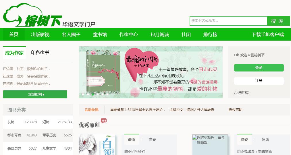 华语文学门户-榕树下(www.rongshuxia.com)是国内历史最悠久、最具品牌的文学类网站,创办于1997年。2009年,盛大文学控股,重新打造新版“榕树下”。“榕树下”曾使无数爱好文学的普通人好梦成真,并凝聚了一批在华语文学界极具影响力的作家,如韩寒、慕容雪村、宁财神、李寻欢、安妮宝贝、邢育森、蔡骏、今何在、郭敬明……“榕树下”多次举办网络文学大赛,余华、苏童、王安忆、王朔、阿城、陈村、麦家、邱华栋、李敬泽等名家均曾出任大赛评委,吸引了全国各地媒体的关注,曾在文化界引发了以“榕树下”为代表的“网络文学”现象的全国大讨论。“榕树下”,是全球最大的原创文学作品稿件库之一,并与国内多家出版社、平面媒体、新闻机构、知名企业建立了良好的合作关系。2009年底,“榕树下”宣布改版上线之后,在原来的原创文学网站基础上,转型为一个传播文学、文化评论及原创写作的权威综合人文媒体,并定位于 华语文学领域的垂直门户。并先后推出“民谣在路上”、“第四届榕树下网络原创文学大展”、著名作家与文化名家专访、组建“中国书评人天团”等活动,获得了 较大影响力。致力于为用户提供网络文学与实体出版书籍的阅读、推荐、评价,业内媒体资讯,文化娱乐社区等服务;为原创作者提供提供完备的网络发表及出版通 道,并将全面追踪、研究华语文学的发展。“榕树下”开始尝试更多领域的文化传播推广事业,为用户量身打造全方位、广角度、立体式的文化产品体验;为出版社、游戏公司、影视机构等版权需求 方提供大容量、多元化、优品质的作品来源。“榕树下”将着眼于整个文化市场,立足于各领域优秀文化产品,致力于化解各种文化产品间的障碍,为用户和版权方 提供文化服务,全力搭建一个高密度文化平台。