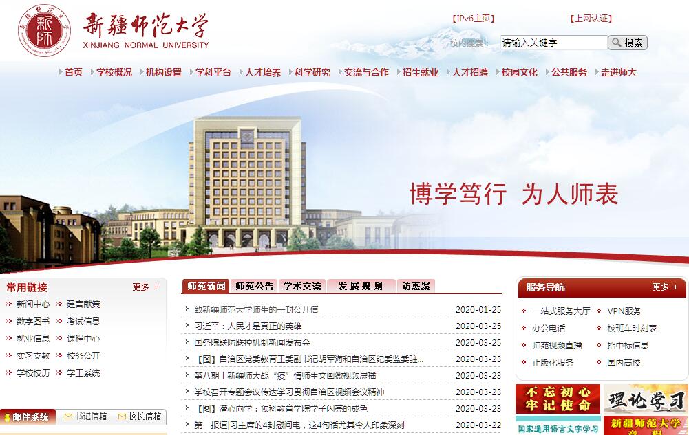 新疆师范大学创立于1978年12月,其前身是乌鲁木齐市第一师范学校和新疆教师培训部,是十一届三中全会在高等教育领域的重要成果之一。伴随着改革开放成长,历经40年风雨历程,新疆师范大学始终坚持政治家、教育家办教育,努力成为支撑新疆教育事业和经济社会发展的坚强力量;始终把加强党的领导作为根本保证,坚持社会主义办学方向,落实立德树人根本任务,将社会主义核心价值观融入教育教学全过程;始终不渝地追求科学、文明、进步与真理,秉承“博学笃行,为人师表”的校训,形成了“团结、敬业、求实、创新”的优良校风;始终以民族振兴和社会进步为己任,为新疆经济社会发展特别是教师教育事业的发展做出了重要贡献。学校先后荣获全国先进基层党总支、全国民族团结进步先进集体、自治区先进基层党组织、开发建设新疆先进集体、自治区文明单位等荣誉称号。学校总占地面积2864亩,分为温泉、昆仑、文光三个校区,分别坐落于水磨沟区观景路100号、沙依巴克区新医路102号、新市区喀什东路16号。温泉校区于2009年启动规划,2010年开始建设,2014年一期工程实现搬迁,目前已成为学校主校区和行政中心,承担学校文科类专业本科、研究生的教育培养任务;昆仑校区现主要承担学校理科、艺术类专业本科、研究生以及继续教育、远程教育、教师干部培训、留学生教育等任务;文光校区主要承担预科教育培养任务。学校现有23个学院,其中,马克思主义学院为全国重点马院。学校于1993年获得硕士单位授权,2013年获得博士单位授权,现有5个一级学科博士学位授权点和1个教育博士专业学位点,18个一级学科硕士学位授权点,9个硕士专业学位授权点,96个二级学科硕士点,61个本科专业,学科专业覆盖了10个学科门类,已形成包括研究生教育、普通本专科生教育、预科教育、中小学教育、学前教育、成人继续教育和留学生教育在内的完整的教育体系。学校现有国家级国际联合研究中心1个,自治区重点学科4个,自治区重点实验室2个,设有新疆教师教育研究中心等自治区高校人文社会科学重点研究基地9个。拥有全国重点马克思主义学院、国家大学生文化素质教育基地、全国高校辅导员发展研究中心、黄文弼中心、新疆社会管理研究院、中亚研究院、沙漠藻研究院、能源与环境研究中心等各级研究机构和平台。学校有教职工2163人(含附中、附小、幼儿园392人)。学校大学部有教职工1771人,其中专任教师1148人,援疆教师8人,同职级待遇教师48人;专任教师中正高级157人,副高级375人,高级职称比例达到46.4%;具有博士学位专任教师310人,硕士学位专任教师620人,博硕比例为81%(其中博士学位专任教师比例27%)。学校现有享受国务院特殊津贴专家4人、国家“万人计划”哲学社会科学领军人才1人、全国文化名家暨“四个一批”人才(理论界)1人、“千人计划”2人、自治区“天山学者”32人、自治区“天山英才”13人、自治区高层次人才3人、自治区“天池博士”14人。学校现有各级各类学生近28000人,其中在校普通本专科生15138人、硕士研究生2835人(含非全日制硕士研究生)、博士研究生60人;成人继续教育学生5572人;预科生2978人;留学生635人。学校注重内涵建设和质量提升,在教学管理和改革方面取得了突出成效。近年来,共获国家级教学成果奖1项,自治区级教学成果奖21项;4个专业被评为国家级特色专业,11个专业被评为自治区级紧缺人才和重点建设的本科专业;1个教学团队被评为国家级教学团队,4个教学团队被评为自治区级教学团队;1个项目被评为自治区教育综合改革试点项目;5个实验教学示范中心被评为自治区级实验教学示范中心;1门课程被评为国家级精品课程,12门课程被评为自治区级精品课程;1门课程被评为国家级精品视频公开课程,1门课程被评为自治区级精品视频公开课程;11个教学研究项目被评为自治区教学改革项目;12名教师被评为自治区级教学名师;11名青年教师被评为自治区级教学能手。我校国家社科基金项目、教育部人文社科项目、新疆社科基金项目立项数和新疆哲学社会科学奖连续多年(届)排名新疆高校第一位。2017年,国家社科基金立项数名列全国高校第59位,教育部人文社科基金立项数名列全国高校第52位。学校拥有教学型、专业型、研究型实验室37个,拥有多媒体教室(含录播室)、语言实验室、电子阅览室共计360间。学校图书馆面积达5.8万平方米,全校图书藏量160.1万册,专业期刊1150种,精选电子期刊2万余种,电子图书 38.878万种,各类数据库31个,数字资源总量超过53.55TB。学校出版《新疆师范大学学报》哲学社会科学版和自然科学版,其中《新疆师范大学学报》(汉文哲社版)是新疆唯一一家入选三(全)核心的社科综合类学术期刊,也是新疆唯一入选国家社科基金重点资助的综合类学术期刊,是西北五省区唯一获得“优秀”定级的国家社科基金资助学术期刊,复合影响因子达3.550、综合影响因子2.114,连续两年位列全国高校综合类学报影响因子第一名。《新疆师范大学学报》(汉文哲社版)首次荣膺“全国百强报刊”荣誉称号,这是新疆目前唯一入选百强的社科期刊,创造了西部期刊办刊奇迹和新疆师范大学学报现象。《双语教育研究》期刊获国家新闻出版广电总局批准,于2014年开始出版。学校高度重视对外交流与合作,积极开展国内外的教育、科技、文化
