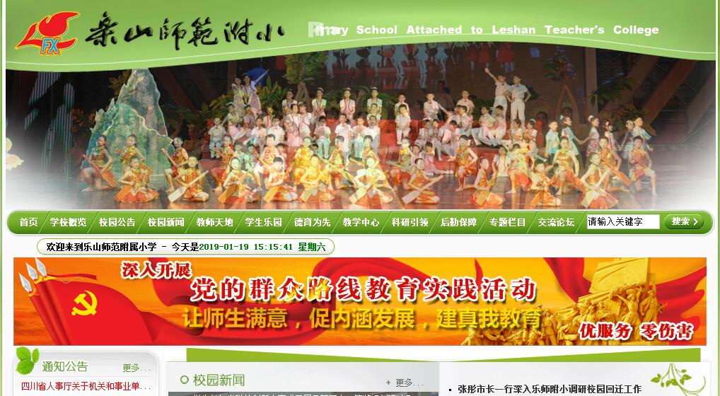 乐山师范学校附属小学创办于1942年,位于乐山城西,紧临三江汇合处,与世界闻名的乐山大佛遥遥相对。学校依山傍水,绿荫环抱,景色宜人,是每一位孩子争先就读的求学之地,也是具有社会广泛赞誉的嘉州名校。目前,学校有教职工88人,32个教学班,学生1785人。伴随着乐山教育事业的发展,乐师附小以骄人的业绩走过了辉煌的历程。其间,学校涌现出了一大批理念先进、师德高尚、业务精湛的教师,是众多优秀教师诞生的摇篮。目前,我校教师中具有研究生学历的2人,在读研究生2人,大学本科学历35人;省级骨干教师4人,市级骨干教师19人;四川省陶行知研究会小学教育专委会课改联盟《学本》开发团队成员2人,乐山市小学语文、数学专委会会员2人;50多名教师先后荣获全国、省、市表彰。在一代又一代附小人的共同努力下,学校先后被评为全国“五讲四美为人师表”先进集体、全国群众体育工作先进集体、全国雏鹰大队、教育部依法治校示范校、全国师德建设先进集体,四川省、乐山市首批校风示范学校、省德育工作先进单位、省教师职业技能示范学校、省少先队工作先进集体、省科技教育先进集体、省科技教育示范学校、省艺术教育特色学校、省艺术教育先进单位、省心理健康教育实验学校、省体育达标先进学校、省陶行知研究会小学教育专委会课改联盟《学本》开发团体会员,乐山市办学水平优秀级学校、市示范性小学、市十佳大队、市素质教育示范校、市贯彻《学校体育工作条例》优秀学校、市依法治校示范校、市卫生先进单位、市卫生工作特色学校、市文明单位、市先进基层党组织、基础教育课程改革先进集体、市体育传统项目示范学校等;在一年一度的市级联系学校综合素质测评中,学校每年都荣获一等奖,每年都上新台阶。在我校教师的爱心浇灌下,在智慧启迪中,一个个德才兼备可持续发展的优秀学子脱颖而出。每一年的学科竞赛中,我校学生省级艺术人才大赛一等奖人数都在50人次左右;近年来,科技创新大赛有2件作品分获国家级一、二等奖,15件作品分获省级一、二、三等奖,近100件作品获得市级奖励,其中尤为突出的是张瑞夫的DV作品——《珠颈斑鸠之繁殖科学探究DV》在国家级、省、市级大赛评选中均荣获一等奖殊荣;多名学生书法、绘画作品曾送美国、日本、新加坡、荷兰展览,也深受好评。全面育人的学校管理,整洁优美的育人环境,求实创新的教师群体,生动活泼的艺体教育,和谐正直的师德师风,后劲十足的附小孩子,已成为附小特色。近年来,全体附小人,怀着“让附小孩子快乐而个性地成长”的信念,坚持“从严求实谋质量,开拓创新求发展,不断进取图卓越”的办学思路,坚持走“质量立校、师资兴校、科研强校、特色亮校”的可持续发展之路,积极实施“内涵提升与外延拓展”,努力践行学校“以良好师德树附小形象,以优质教育创附小品牌,以制度情感强附小管理,以教育科研促和谐发展”,全面落实“立足课堂教学改革,培养学生文化素养;拓展第二课堂探究,发展学生个性潜能”的办学举措,以满腔的热情和不懈的努力来实现 “教师职业幸福,学生和谐发展,成就素质名校”的办学目标。目前,在各级各类领导的亲切关怀下,学校改建已经顺利完成。建成后的附小是一所建筑面积达14000多平方米可以容纳36个教学班级的设施齐全、功能先进的窗口名校。