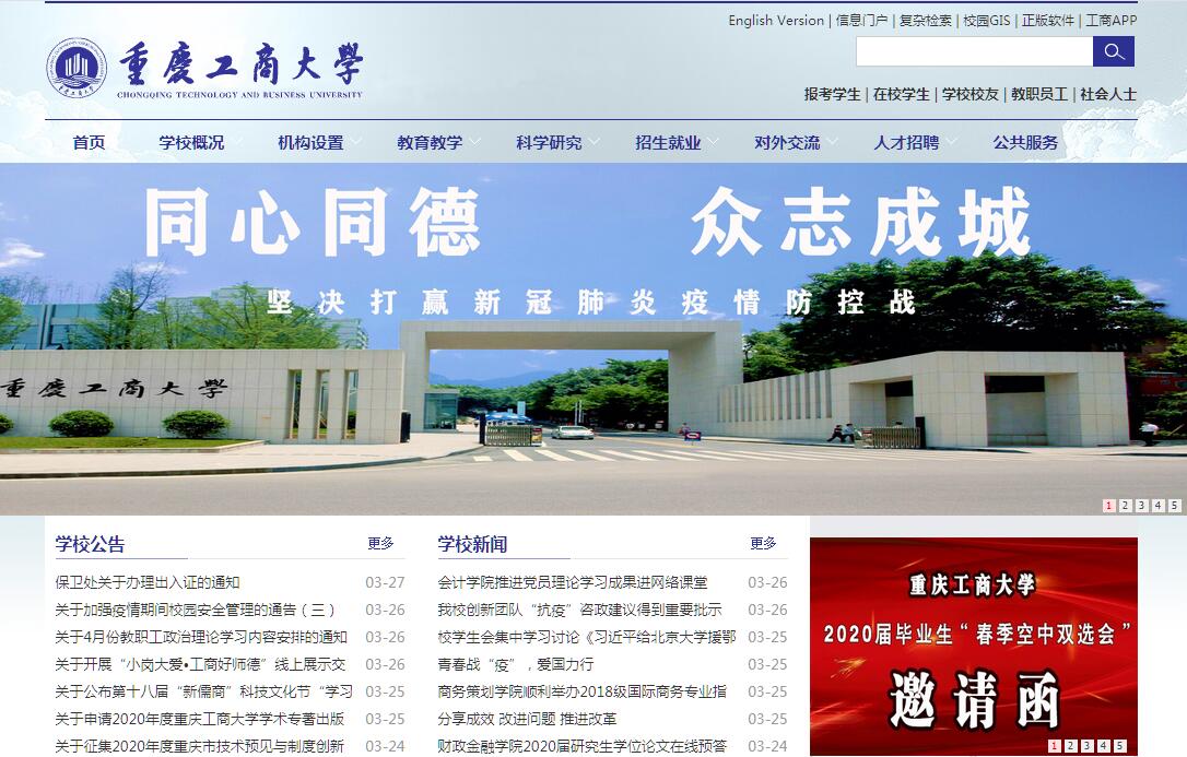 重庆工商大学始创于1952年,2002年1月18日经教育部批准,由原渝州大学和原重庆商学院合并组建而成,是一所经济学、管理学、文学、工学、法学、理学、艺术学等学科协调发展的、具有鲜明财经特色的多科性大学。学校由中央和地方共建,以重庆市政府管理为主,是国家“中西部高校基础能力提升计划”重点支持高校。学校传承和弘扬“含弘自强、经邦济民”的重庆工商大学精神,秉持“质量立校、特色兴校、人才强校”的办学理念,遵循“厚德博学、求是创新”的校训,不断深化教育教学改革,坚定不移地走内涵发展之路。构建了涵盖7个学科门类、布局合理的学科体系。设有19(不含MBA、MPAcc、通识学院)个教学学院,76个本科专业,其中有4个国家级特色专业、5个市级特色学科专业群、22 个市级特色专业,1个国家卓越农林人才教育培养改革试点项目。有1个服务国家特殊需求博士人才培养项目——三峡库区百万移民安稳致富国家战略人才培养项目(应用经济学),1个应用经济学博士后科研流动站和2个博士后科研工作站。有应用经济学、工商管理两个重庆市一流学科,10个重庆市“十三五”市级重点学科,12个一级学科硕士学位授权点,14个专业硕士学位授权点。学校现有教职工近2100余人,其中专任教师1600余人,具有高级职称的教职工730余人,具有博士学位、硕士学位的教师近1230余人。有国家“万人计划”人选、“新世纪百千万人才工程”国家级人选、国家有突出贡献的中青年专家、“长江学者奖励计划”人选、全国宣传文化系统“四个一批”人才、享受国务院特殊津贴专家、重庆市两江学者特聘教授、重庆市首席专家工作室领衔专家、重庆市“特殊支持计划”人选、重庆市有突出贡献的中青年专家、重庆市学术技术带头人、重庆市“百人计划”人选、巴渝学者特聘教授等高层次人才和全国五一奖章获得者、全国师德先进个人等优秀教师代表。学校紧密结合区域经济社会发展的人才需求,着力培养具有创新精神和实践能力的应用型复合型高素质专门人才。在2006年教育部普通高校本科教学工作水平评估中获得“优秀”。学校现有在校全日制普通本科学生、研究生3万余人。拥有国家级经济管理类实验教学示范中心、国家级经济管理虚拟仿真实验教学中心、国家级环境与资源化学技术实验教学中心、全国大学生文化素质教育基地、国家级大学生校外实践教育基地。学生在“挑战杯”全国大学生课外学术科技作品竞赛等高水平学科竞赛中获得国家级、省部级奖项2500余项。建校66年以来,学校已为社会输送了各层次毕业生10余万名,大批学子已成为技术、管理、科研和教学等领域的骨干,为国家经济建设和社会发展做出了积极贡献。2012年学校获评为“全国毕业生就业典型经验高校”。学校高度重视科学研究和科技开发,积极促进科学成果转化,为区域经济建设和社会发展服务。拥有智能制造服务国际科技合作基地、长江上游经济研究中心教育部人文社科重点研究基地、废油资源化技术与装备教育部工程研究中心等35个国家级、省部级科研机构。近年来,学校共承担各级各类科研项目5200项,其中国家级科研项目210余项,省部级科研项目1800余项,接受党政机关、企事业单位委托开展决策咨询、管理咨询、技术咨询研究3100余项;在咨政服务、决策支持和科技成果转化方面取得了突破性进展,共向各级党政机关提交智库成果850余份,其中被中央领导人批示24项,被省部级领导批示35项;累计249项科技创新成果实现转移转化,2016年进入中国高校专利技术转让100强。获国家科技进步二等奖、教育部科技进步一等奖、教育部高校科学研究优秀成果奖(人文社科类)二等奖等多项全国性重要科研奖励。研制的野外环境红外火灾监测智能传感网核心技术、TY-II透平油滤油机系列产品达到国际先进水平。《西部论坛》杂志同时入选北京大学图书馆《中文核心期刊要目总览》(2014年版)和南京大学CSSCI来源期刊(扩展版)。学校坚持开放办学,走国际化办学道路。设有两个教育部批准的中外合作办学机构(国际商学院和现代国际设计艺术学院)。与加拿大蒙特利尔高等商学院、法国马赛大学等10余所国际知名高校联合培养学士、硕士,与25个国家(地区)的90所高校建立了合作伙伴关系,开展全方位、宽领域、多层次的国际合作交流,开设了ACCA、CFA等国际特色项目班,获批国家级国际科技合作基地,并被评为重庆市国际交流合作示范校。学校还与200多个地方政府、企事业单位建立了战略合作关系,积极开展政产学研协同育人。学校坚持环境育人、文化育人理念,倾力打造花园式校园,是重庆市“十佳园林式”“文明单位”和重庆市首批“美丽校园”。学校现占地总面积2504.61亩,各种基础设施完备,教学及科研设备齐全。图书馆藏书纸质图书286.51万册,电子图书和电子期刊321.0242万册,中外文期刊2550余种。校园网承载有多种数字化教学、科研、管理、服务信息系统和数字资源。学校是重庆教育城域网主环节点之一,承担着为周边高校及教育科研单位服务的职能。学校被评为首批全国节约型公共机构示范单位、重庆市“数字校园”示范学校和教育信息化试点单位。