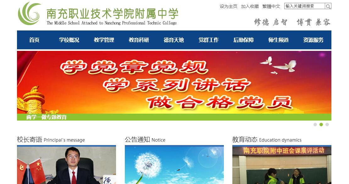 南充职业技术学院附中是南充市教育局直管的初级中学校,是一所教育理念先进,文化氛围浓厚,教师爱岗敬业,学生素质发展全面,社会满意家长放心的精品学校。学校现有学生1300多人,21个教学班,教职工83人,中学特级教师1名,高级教师16人,全国优秀教师1名,全国优秀园丁1人,全国数学奥林匹克竞赛优秀教练3人,四川省优秀教师1名,四川省青年骨干教师19人,南充市学科带头人10人,市区级优秀教师、优秀班主任、骨干教师30人。学校始终坚持内涵发展道路,精心培育名师,促进教师专业发展,坚持科研兴校,提高教育研究水平,努力在科研中求发展、求活力,求创新,全力推动教科研质量和教育教学的发展。学校加强教育教学质量管理,深入推进课堂教学改革,促进教师教学方式和学生学习方式的转变,教育教学质量和办学效益不断提升。学校大力推进校园文化建设,整合各种文化资源,重新建构了学校文化,创造人工和自然相和谐的校园,编织文化与自然环境的立体空间,营造人与自然和谐共存的人文环境。学校秉承“对每一位学生的终生发展负责”办学理念,弘扬“自强不息,勇于创造”学校精神,怀着“十年磨一剑”的恒心和“天道总酬勤”的信心,抢抓机遇、励精图治、趁势而上,实现了学校教育品牌和教师专业成长的和谐发展,实现了学生学业成绩与个性特长的和谐发展,实现了学校办学质量和办学特色的和谐发展。学校先后荣获国家教育部“十•五”重点课题实验学校、全国养成教育重点试验学校,全国数学竞赛先进集体、全国青少年道德培养实验基地、四川省学生潜能开发实验学校、四川省卫生先进单位、四川省教育系统先进集体、四川省艺术教育特色学校、四川省新成长型学校、南充市示范初中、南充市文明单位、南充市现代信息技术示范学校、南充市平安校园学校等国家、省、市级荣誉称号。学校多年连续获得教学过程管理一等奖,教育质量综合评价一等奖.省级科研课题《学校班班通》获省一等奖。在今后的工作中,我们将以科学发展观为指导,坚持内涵发展,特色发展,和谐发展,以提高质量为根本,全面深入贯彻落实我市教育工作会议精神,以人为本,树立和落实创新意识,内强素质,外塑形象,从严治校,创建特色。继续强化创新意识、质量意识、服务意识,争先意识、拼搏意识,围绕课程改革,扎实开展教育科研,深入推进素质教育,强化各项管理,趁势而上,确保学校各项工作继续上新的台阶,努力办好人民满意的教育。