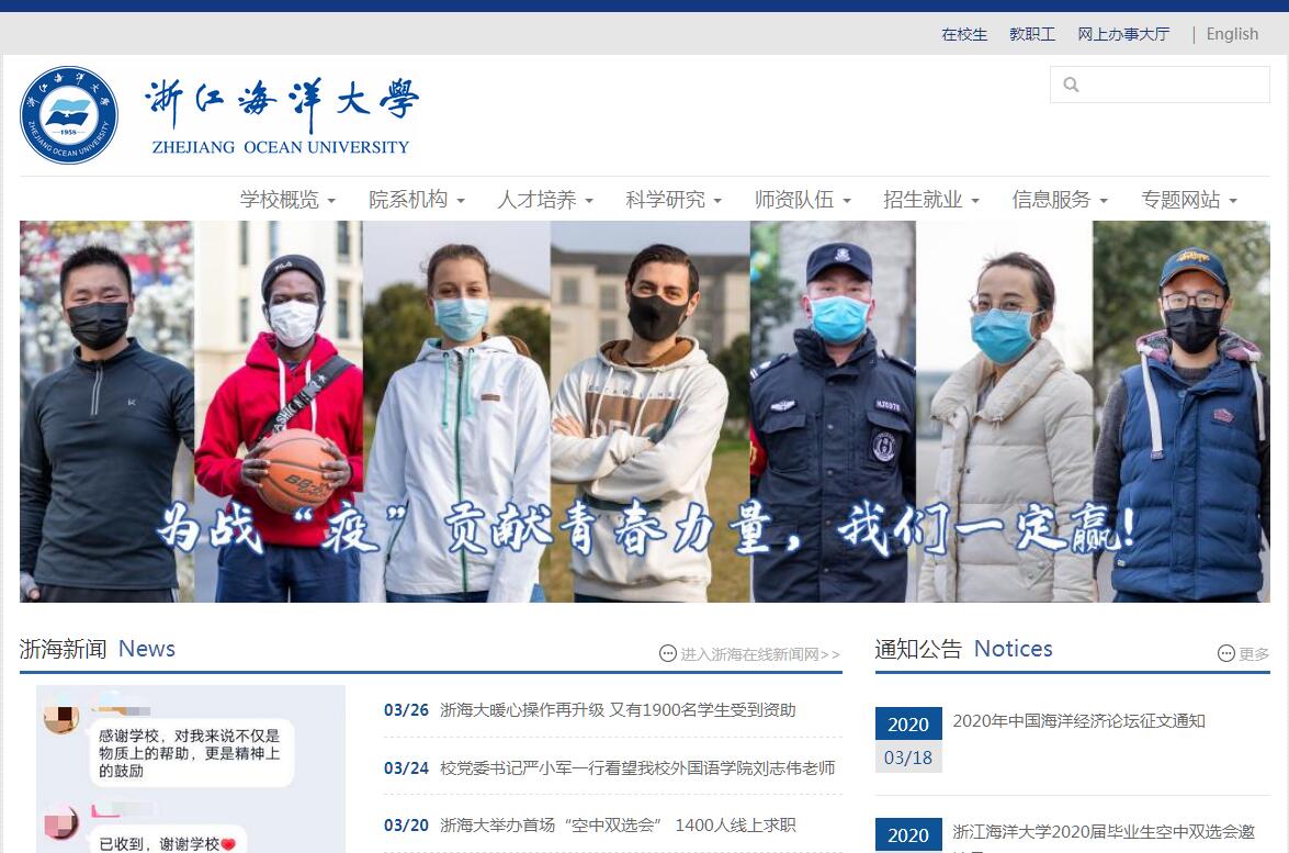 浙江海洋大学是一所国家海洋局与浙江省人民政府共建的教学研究型大学。学校创建于1958年,始名舟山水产学院,1975年更名为浙江水产学院,1998年与舟山师范专科学校合并组建为浙江海洋学院,2000年之后舟山卫生学校、浙江水产学校、浙江省海洋水产研究所、舟山石油化工学校和舟山商业学校等学校(单位)相继并(进)入,2016年更为现名。60年来,学校数易校址、历经变迁,积淀形成了“海纳百川、自强不息”的校训精神,为我国东部特别是浙江省海洋人才培养、科技创新、产业升级和文化传承做出了重要贡献,逐步探索出了一条符合高等教育发展规律、与区域经济社会发展紧密结合、海洋特色日趋鲜明的办学之路。学校现有新城校区和定海校区2个校区,其中,主校区新城校区位于浙江舟山群岛新区长峙岛,枕山环海,风景宜人,是求学的理想之地。学校的建设和发展一直得到党和国家领导人的亲切关怀和大力支持。习近平总书记主政浙江期间两次莅临学校视察指导工作。习近平在学校视察时,对学校坚持海岛办学给予了充分肯定,要求学校继续走艰苦奋斗之路,围绕地方经济建设,努力办出特色,为全省海洋经济发展作出贡献。李铁映、姜春云、赵洪祝、郝建秀、路甬祥、韩启德、周铁农、蒋树声、董建华、何厚铧、宋健等党和国家领导人在视察学校或办学题词时,对学校发展寄予厚望。张德江、李强、夏宝龙、铁瑛、李泽民、李丰平、柴松岳等历任省领导多次视察指导学校工作,对学校发展给予了高度关注和大力支持。中共中央政治局原常委、第八届全国人大常委会委员长乔石同志为学校题写校名。学校总占地面积2597亩(其中海域使用面积720亩),校舍建筑面积47.7万平方米,纸质图书175.5万册,教学科研仪器设备资产3.6亿元。开展硕士研究生教育、普通本科教育、继续教育及留学生教育,与国(境)外高校联合培养博士研究生。设有理学、农学、工学、管理学、经济学、文学、历史学、教育学等学科门类,现有省一流学科A类2个、B类7个。拥有海洋科学、水产、船舶与海洋工程、石油与天然气工程、食品科学与工程、农林经济管理、机械工程、数学、水利工程9个一级学科硕士点,工程、农业、教育、旅游管理、药学5个专业硕士学位类别,并具有同等学力硕士学位授予权。设置48个本科专业,其中国家特色专业2个,省重点专业9个,省优势专业4个,省新兴特色专业8个。现设有10个学院,建有浙江省海洋水产研究所、创新应用研究院、东海发展研究院3个跨学科科研机构,举办独立学院——浙江海洋大学东海科学技术学院。拥有各类全日制在校学生10785人;教职工1010人,其中专任教师729人。专任教师中具有博士学位307人,具有高级专业技术职务387人,其中正高级技术职务143人。拥有双聘院士9人、“长江学者”特聘教授、国家“万人计划”、国家“百千万人才”、国家“千人计划”、国家“杰出青年基金”获得者、教育部“新世纪优秀人才支持计划”、国务院特殊津贴专家45人,入选省“千人计划”、省“钱江学者”、省“151”人才工程等99人,省级教学、科技创新团队9个。学校坚持以人才培养为中心,以社会需求为导向,致力于培养德智体美全面发展的、具有国际视野和海洋精神、人文素养和合作竞争意识、创新创业能力和实践技能的复合应用型人才。教学成果曾获国家二等奖1项,近五年来,获省级教学成果一等奖4项、二等奖4项。学校是教育部新工科研究与实践项目、国家卓越农林人才教育培养计划改革项目试点高校,建有国家级实验教学示范中心、国家级大学生校外实践教育基地、国家自然科学基金委野外实习基地(共建)以及国内首个海岛野外生存教学实验基地,是海洋类高校中唯一的国家级创新人才培养示范基地(共建)。近5年来,学生在各类学科性竞赛中获国家级奖150余项、省部级奖3210余项,其中全国“挑战杯”大学生创业大赛金奖2项、“累进创新专项奖”金奖1项,全国“挑战杯”大学生课外学术科技作品竞赛特等奖1项、全国“互联网+”创新创业大赛银奖1项。学生获“2016年中国青少年科技创新奖”,学生团队获全国大学生“小平科技创新团队”称号。学校被评为全国高等学校创业教育研究与实践先进单位、全国深化创新创业教育改革特色典型经验高校,被列为国家级大学生创新创业训练计划项目实施高校,毕业生就业率保持在96%以上。学生社会实践系列调查报告集《蓝色报告》得到时任浙江省委书记习近平的来信肯定。“海洋文化”被评为浙江省高校首批校园文化品牌。涌现出了党的十九大代表范群,“2010感动中国候选人物”钟杏菊,国家科技进步奖获得者、“全国劳动模范”张本,国家科技进步奖获得者、“全国优秀农业科技工作者”徐君卓,“全国教书育人楷模”张赛芬,“全国农业劳动模范”沈竑,联合国粮农组织官员叶益民,中国石油化工集团公司副总经理张海潮,银泰集团创始人沈国军,勇救同事壮烈牺牲的“人民教师”王成海等一批优秀校友。学校聚焦国家重大战略需求和地方经济社会发展需要,不断完善科研创新体系,努力提升科研水平和创新能力。科研成果曾获国家科技进步奖一、二、三等奖及全国科学大会奖11项。近5年来,承担国家973计划、863计划、国家重点研发计划、科技支撑计划、国际科技合作计划等国家级科研项