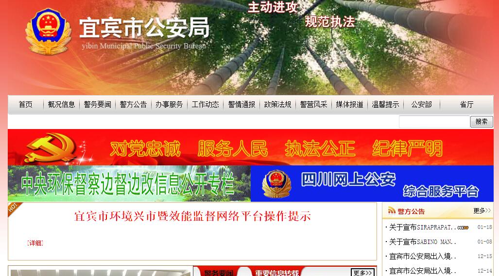 宜宾市公安局主要职责:1、贯彻执行国家公安工作的方针、政策和法律、法规、规章,部署全市公安工作并指导、检查、监督全市各级公安机关贯彻执行;负责本系统、本部门依法行政工作,落实行政执法责任制。2、指导、协调全市公安机关应急管理、抢险救援工作和社会公共突发事件的处置工作。3、指导全市公安法制建设,按管辖办理行政诉讼、行政复议案件。4、组织指挥、指导全市公安侦查工作,协调处理或直接侦办全市重大刑事犯罪案件及重大经济犯罪案件;5、组织、指导、监督全市公安机关查处危害社会治安秩序行为;协调处置重大治安灾害事故;组织实施重大活动的安全保卫工作;依法管理户口、居民身份证、流动人口、枪支弹药、危险物品、特种行业等工作;依法管理集会、游行、示威活动。6、指导、监督、实施全市公安机关对国家机关、社会团体、企事业单位和重点建设工程的治安保卫工作以及群众性组织的治安防范工作。7、负责全市出入境管理工作。组织、指导全市出境、入境和持普通护照的外国人、港澳台人员在宜有关管理工作;依法管理国籍工作。8、组织实施消防监督、火灾预防和扑救工作;对易燃易爆物品的消防安全工作进行监督指导。9、指导、组织实施全市公安警卫工作。10、指导、监督、实施全市公安机关对公共信息网络的安全保护工作,负责信息安全等级保护工作的监督、检查、指导。11、指导、监督全市公安机关依法承担的执行刑罚和监督、考察工作;指导、监督全市全市监管场所的管理工作。12、组织、指导、实施全市公安机关维护道路交通安全、交通秩序;组织、协调处置重特大交通事故;依法开展机动车辆和驾驶员的管理工作。14、组织、指导全市公安机关队伍建设、人事管理、民警教育训练、宣传等工作,按规定权限管理干部。15、承担市政府公布的有关行政审批事项。16、承办市政府和省公安厅交办的其他事项。