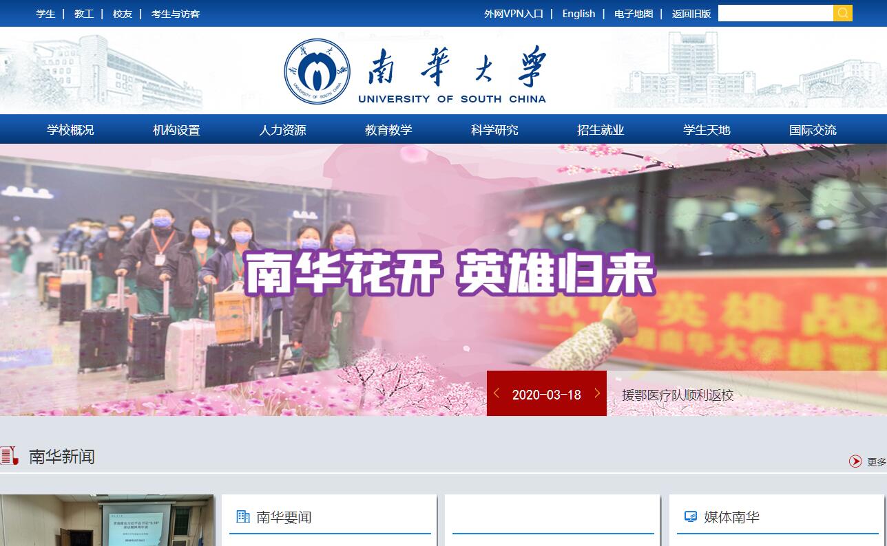 南华大学是国家工业和信息化部、国防科技工业局、中国核工业集团公司、中国核工业建设集团公司与湖南省人民政府共建的综合性大学。学校由中南工学院与衡阳医学院合并组建,核工业第六研究所并入,是国家中西部高校基础能力建设工程支持建设高校,是教育部批准的卓越工程师、卓越医生教育培养计划单位,是本科一批招生院校。学校坐落在湖南省衡阳市,现有红湘和雨母两个校区。在60年的发展历程中,学校秉承“明德、博学、求是、致远”的校训,弘扬“勤勉务实、甘于奉献、刚健自强、敢为人先”的南华精神,始终坚持本科教学中心地位,不断推进事业全面发展。进入新世纪以来,学校依据“教学研究型大学”的办学定位,明确了“特色鲜明、国内一流、具有国际影响的高水平教学研究型大学”的发展目标,确立了本科教育人才培养目标。学校形成了以工学、医学为主,哲学、经济学、法学、文学、理学、管理学、艺术学等9大学科协调发展的学科专业体系。设有直属学院23个,直属型附属医院4所,协作型附属医院11所,研究生协作培养单位25个。设有本科专业77个,一级学科硕士学位授权点24个,硕士专业学位授权类别13种;一级学科博士学位授权点5个;一级学科博士后科研流动站3个。学校面向全国(含港澳台)以及世界部分国家和地区招生。现有学生50000余人,其中全日制本科生近30000人,博士、硕士研究生近4000人,国际学生400余人,成人教育本专科生近18000人。校本部现有教职工2316人,其中专任教师1419人;直属型附属医院临床教师2947人。共有教授、主任医师等正高职称人员398人,副高职称人员1233人;有国家国防科技创新团队、部省级创新团队、省高校科技创新团队、省级教学团队14个;有国家级突出贡献中青年专家、“千人计划”专家、国家杰出青年基金获得者、长江学者特聘教授、享受国务院政府特殊津贴专家等100余名,有省部级学科学术带头人、教学名师、优秀中青年专家等220余名。学校拥有国家级特色专业、国防重点专业和紧缺专业、卓越计划专业、综合改革试点专业15个,国家级实验教学示范中心、虚拟仿真实验教学中心、实践教育基地6个,国家级精品课程和精品开放课程3门。有省级校企合作人才培养示范基地、创新创业带动就业示范基地、高校大学生创新创业孵化示范基地等29个,综合性实习基地347个。学校临床医学学科进入ESI全球排名前1%。拥有全国首批国家核应急宣传和培训基地、国家核应急医学救援队、全国核科普教育基地,拥有国家国防支撑学科和省级重点学科10个、国家国防特色学科5个,拥有核能与核安全国家示范型国际科技合作基地、湖南省协同创新中心3个、省部级重点实验室/研究中心22个、湖南省院士工作站3个、其他各类省级科研平台/基地21个、行业重点实验室13个。先后承担“863”计划、“973”计划、国家自然科学基金重大研究计划、国家自然科学基金重点、科技部重大专项、国防基础研究计划、核能开发专项等科研项目2000余项;获得国家级科技奖励12项,省部级科技奖励300多项。学校成立了由省部政府机构、核工业四大央企、大型科研院所、大型三甲医院、大型企事业单位等组成的董事会;与国际组织和国内外近100所高等院校和科研机构建立了合作协作关系。图书馆纸质藏书260余万册,中外文期刊2400余种,数字资源352TB,其中电子图书78.5TB。学校主办《中国动脉硬化杂志》、《中南医学科学杂志》、《南华大学学报·自然科学版》、《南华大学学报·社会科学版》等学术期刊。学校是全国普通高等学校招生工作先进集体、全国毕业生就业典型经验高校、全国青年就业创业教育先进集体、全国军工文化教育基地;是湖南省文明单位、国防教育基地、学生资助工作先进单位。60年来,学校为国家及地方输送了近24万名各类高素质专门人才,涌现出了一批以中国科学院院士、省部级领导、行业领军人物等为代表的优秀校友。毕业生广泛分布在国防工业、核工业、卫生与健康、环境保护、装备制造、金融管理等行业,成为所在单位技术、管理骨干,为国家建设和发展、社会文明和进步、地方经济建设和社会发展做出了积极贡献。学校第三次党代会提出了“一基三实、一路三建”的发展思路,即夯实人才队伍之基,把人才培养做实、把科学研究做实、把服务社会做实;走内涵发展之路,加强专业建设、学科建设、创新能力建设。这一新思路引领学校向特色鲜明的高水平教学研究型大学迈进。