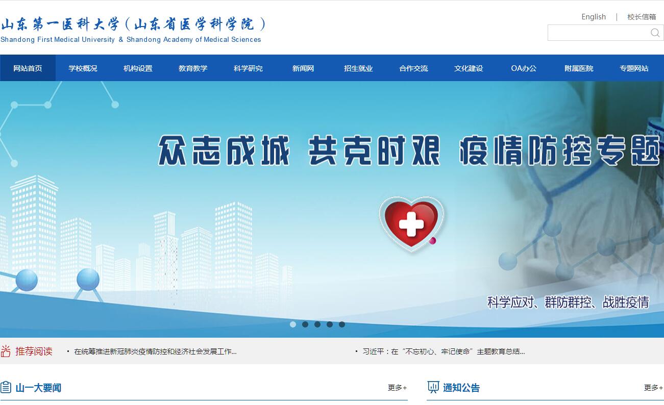 为优化山东省高等教育发展布局,实现内涵式发展,山东省委省政府实施科教融合战略,整合泰山医学院、山东省医学科学院等资源组建山东第一医科大学。2019年2月,山东第一医科大学正式成立,同时挂山东省医学科学院牌子。山东第一医科大学(山东省医学科学院)是山东省重点建设的应用研究型大学,也是山东省最大的医学科学研究机构。校(院)设有济南、泰安两个校区,在济南、青岛、济宁等地建有研究机构,总占地面积6000余亩。主校区位于济南国际医学科学中心核心区域,规划占地面积约2600亩,建筑面积90万平方米。泰安校区占地3000余亩,校舍面积82万平方米。校(院)拥有一支以中国工程院院士领衔的高层次师资和科研队伍。目前,有教职工5566人。其中,中国工程院院士3人,副高及以上专业技术人员1831人,具有硕士、博士学位人员3395人。现有44个本科专业,5个硕士学位授权一级学科,64个硕士学位授权点,6个山东省重点学科,是博士学位授予立项建设单位。临床医学学科已连续六年进入ESI世界排名前1%。校(院)依托人才优势,开展医学基础研究和应用基础研究,取得一系列具有重大社会效益和经济效益的研究成果。近五年,共承担国家科技支撑计划、国家重点研发计划等28项;获得国家科技进步奖二等奖3项,何梁何利基金科学与技术进步奖1项,山东省科学技术最高奖2项,山东省科技奖励一等奖7项。拥有省部共建国家重点实验室培育基地、国家卫健委重点实验室、省重点实验室等高水平创新平台。校(院)临床医疗和疾病防治实力雄厚,拥有三级甲等医院9所,其中综合医院4所、专科医院5所;国家临床重点专科16个,国家药物临床试验机构6个。曾在全国率先实现以省为单位基本消灭黑热病、丝虫病、疟疾、麻风病,夺得新中国灭病史上“四连冠”,目前指导全省开展职业病、皮肤病、寄生虫病、肿瘤早诊早治、辐射防护、防盲治盲、罕少见疾病防治工作;拥有世界卫生组织合作中心。校(院)是首批颁发山东省政府外国留学生奖学金院校,自2004年起招收来自美国、韩国、加拿大、印度、尼泊尔等20余个国家和地区的本科和硕士留学生,国际办学声誉良好。先后与美国、英国、澳大利亚、俄罗斯、日本等30余个国家及港澳台地区的高校和医疗、科研机构建立了良好的合作关系;6名外籍合作专家荣获“齐鲁友谊奖”。校(院)将以建成国内一流、国际上有重要影响的,有明显优势和特色的应用研究型大学为目标,不断增强人才培养、科技创新、成果转化、医疗卫生服务等方面的实力,助力新旧动能转换重大工程和医养健康产业发展,充分发挥在重大疑难疾病的诊疗与防治、医学帮扶、国际医疗服务、产学研合作等领域的作用,为全省乃至全国的高等医学教育和医学科学事业作出新的更大贡献。