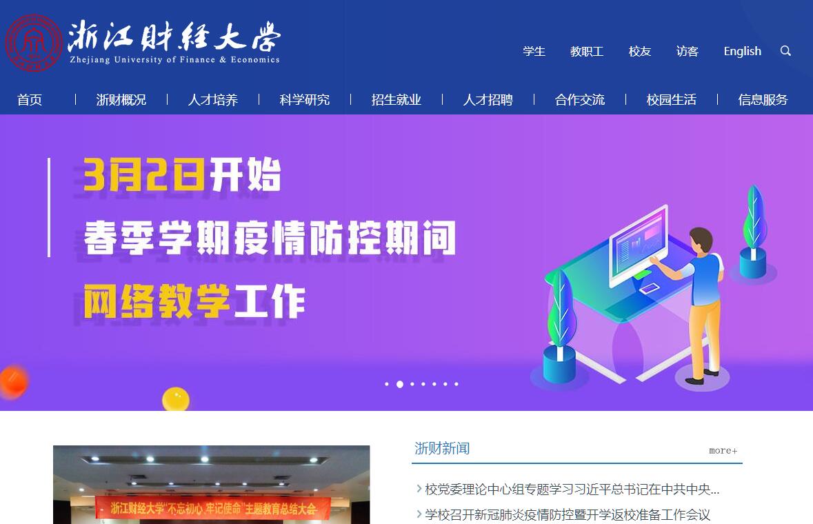 浙江财经大学坐落在素有“人间天堂”美誉的浙江省杭州市,是一所以经济、管理学科为主体,经、管、文、法、理、工、艺、哲等多学科协调发展的财经类高校。学校前身是创建于1974年的浙江财政银行学校,1987年获准成立浙江财经学院,1991年获得学士学位授予权,2003年获得硕士学位授予权,2012年获批服务国家特殊需求博士人才培养项目,2013年更名为浙江财经大学,2014年获批博士后科研流动站,2017年被列入浙江省重点建设高校,2018年获批博士学位授予单位。学校现有下沙、文华、翠苑和长安4个校区,占地2300亩,总建筑面积98.5万平方米。设置有16个学院,1个教学部,1个独立学院,3个研究院。具有博士、硕士、学士学位授予权和外国留学生、港澳台学生招生权,在校普通全日制学生15000余人(不含独立学院)。自建有诺贝尔经济学奖文献馆、孙冶方经济科学奖文献馆、政府管制文献馆、浙财文库、专业经典阅读文库等5个特色库。学校坚持把人才作为核心资源,不断提高师资队伍实力。在校教职工1570余人,专任教师1090余人,正高级职称160余人,副高级职称350余人,具有博士学位专任教师590余人。设有应用经济学博士后科研流动站。拥有国家“万人计划”哲学社会科学领军人才、国家宣传文化系统“四个一批”人才、国家“百千万人才工程”人选、国家级有突出贡献中青年专家、教育部“新世纪优秀人才支持计划”人选、省“新世纪151人才工程”人选等省级及以上人才100余人。另聘有100余名国内外知名专家、学者为兼职教授。学校坚持立德树人,确立了“应用型、复合型、创新型、创业型高素质人才”培养目标。持续推进教育教学改革,全面实施本科生综合导师制,努力为学生的成长成才提供良好的环境和制度保障,不断拓展、优化学生修读主专业和辅修专业的途径。设有45个本科专业,其中4个国家级特色专业、1个国家专业综合改革试点项目、6个省“十三五”特色专业、8个省“十三五”优势专业。拥有1个国家级教学团队、4个省级教学团队,8门国家级精品课程(资源共享课程)、36门省级精品课程(在线开放课程),14部国家级教材、55部省级教材,11个省级及以上校外实验、实践教育基地。学校坚持把学科建设作为发展龙头,大力加强学科和学位点建设。拥有应用经济学一级学科博士点,“城市公用事业政府监管”博士人才培养项目,9个一级学科硕士点,13个专业硕士学位点。应用经济学为省优势特色学科,应用经济学、统计学等2个学科为省A类一流学科,公共管理、工商管理、理论经济学、中国语言文学等4个学科为省B类一流学科。学校坚持把科研创新作为强校之路,不断提高社会服务能力。拥有省哲学社会科学重点研究基地2个,省级2011协同创新中心1个,省新型高校智库1个,省重点创新团队1个,省高校创新团队1个,省高校高水平创新团队2个。先后有4位教师的独著或合著成果获得孙冶方经济科学奖。近年来,学校获得省部级及以上科研成果奖67项,承担国家级科学研究项目271项、省部级科学研究项目811项,哲学社会科学类国家级科研项目立项数位居浙江省属高校前列。与政府机构、行业协会和企事业单位深入开展战略合作,大力加强政产学研协同创新,众多研究成果得到省部级及以上领导的重要批示,为国家部委和省委省政府制定政策提供智力支持。学校坚持把开放办学作为桥梁纽带,不断深化国际交流与合作。已与30个国家和地区的111所高校建立良好的校际关系,开展教师互派、学生互换、科研合作等国际交流,举办中加会计学专业、中美市场营销专业、中英金融学专业等中外合作办学项目。留学生数量逐年增长,先后有70余个国家和地区的留学生来校学习。拥有浙江省唯一的ACCA、CGA考试中心,ACCA考试中心被评为ACCA白金级教育机构。浙江财经大学秉承“进德修业,与时偕行”的校训,践行“明德笃学,经邦济世,崇实创新,勇立潮头”的财大精神,为国家经济建设和社会发展培养了10万余名各级各类高素质人才,被誉为浙江财税干部的“黄埔军校”、会计师的摇篮、金融家的沃土、企业家的殿堂。学校正在大力实施“党建领校、质量立校、人才兴校、科研强校、文化荣校、校友名校”的发展战略,努力建设国内一流、国际知名、特色鲜明的创新创业型财经大学。