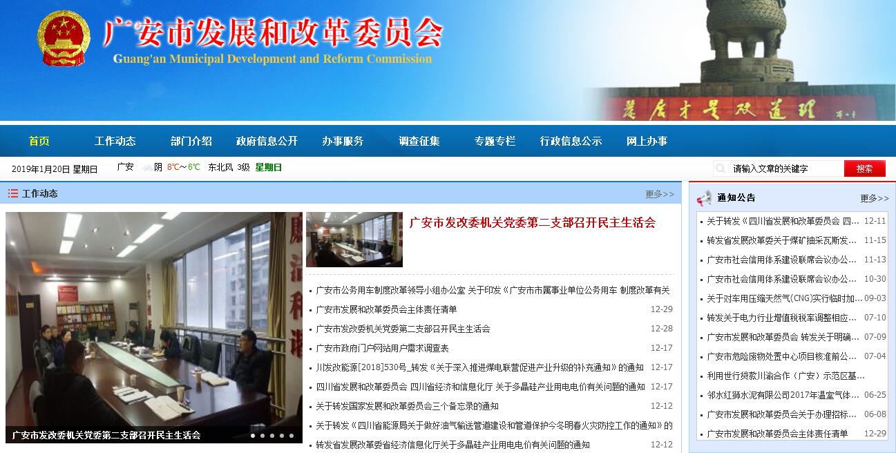 广安市发展和改革委员会主要职能:(一)贯彻实施国家、省有关国民经济和社会发展、经济体制改革的方针、政策和法律、法规。拟订全市有关国民经济和社会发展、经济体制、能源发展和改革的规范性文件,负责本系统、本部门依法行政工作,落实行政执法责任制。(二)拟订并组织实施全市国民经济、社会发展、能源发展中长期规划和年度计划,统筹协调全市经济社会发展,研究分析宏观经济形势,提出全市经济社会发展、经济结构优化、能源发展、价格总水平调控目标和政策建议。受市政府委托向市人大提交国民经济和社会发展计划报告。(三)负责监测宏观经济和社会发展态势,承担预测预警和信息引导的责任,研究宏观调控重大问题并提出政策建议,搞好总量平衡,综合协调经济社会发展中的重大问题。负责开发区的指导、协调和审核转报等工作。(四)负责汇总分析全市财政、金融、能源等方面情况,参与制定财政、金融、土地政策,综合分析政策执行效果;负责全 市全口径外债的总量控制、结构优化和监测工作,提出多渠道融 资的政策建议,综合协调财政、金融、价格、能源和产业政策等 经济杠杆,保证全市国民经济计划和发展规划的实施。(五)承担指导推进和综合协调全市经济体制改革的责任,研究经济体制改革和对外开放的重大问题,组织拟订综合性经济 体制改革方案,协调有关专项经济体制改革方案,会同有关部门 搞好重要专项经济体制改革之间的衔接,指导经济体制改革试点 和改革试验区工作。(六)贯彻实施国家、省价格法律、法规和方针、政策,编制和执行价格调整改革规划,拟订年度价格总水平调控目标及价 格调控措施并组织实施,管理国家、省、市列名管理的商品和服 务价格,监管实行市场调节价的商品和服务价格,承担行政事业性收费管理工作,负责全市价格监督检查、价格成本调查监审、 价格监测、价格认证等工作。(七)负责全市投资宏观管理和协调推进重大项目建设。拟订全社会固定资产投资总规模和投资结构的调控目标、政策及措施,安排市级预算内基本建设资金,按规定权限审批、核准、备案或转报固定资产投资项目(企业技术改造项目除外)和资源开 发利用、外资、境外投资项目。引导民间投资方向,研究提出利 用外资和境外投资的规划、总量平衡和结构优化的目标和政策,指导和协调国外贷款项目实施。组织开展重大建设项目稽察。指导工程咨询业发展。(八)推进经济结构调整。组织拟订全市综合性产业政策,负责协调第一、二、三产业发展的重大问题,衔接平衡相关发展规划和重大政策,协调农业和农村经济社会发展的重大问题,衔接农村专项规划和政策。拟订重大产业发展规划,引导全市重大 生产力合理布局,协调推进全市重大技术装备推广应用和重大产业基地建设,会同有关部门拟订服务业、现代物流业发展规划和重大政策。组织拟订高技术产业发展、产业技术进步的规划和重 大政策,指导全市自主创新体系建设发展。(九)促进城乡区域协调发展。组织编制全市主体功能区规划并协调规划实施和进行监测评估,拟订区域协调发展规划和重 大政策建议,研究提出城镇化发展规划和统筹城乡发展的重大政策,负责地区经济协作的统筹协调。(十)负责重要商品总量平衡和宏观调控。研究分析市内外 市场和对外贸易运行情况,编制重要农产品、工业品和原材料进出口总量计划并监督执行。会同有关部门管理粮食等重要物资和 商品的市级储备工作,拟订重要商品市场、生产要素市场的总体 布局和发展规划。(十一)负责全市社会发展与国民经济发展的政策衔接,组织拟订社会发展规划和年度计划,参与拟订人口和计划生育、科 学技术、教育、文化、卫生、民政等发展政策,推进社会事业发展。研究提出促进就业、调整收入分配、完善社会保障与经济协 调发展的政策建议,协调社会事业发展和政策中的重大问题及政策。(十二)推进可持续发展,负责全市节能减排的综合协调工作,组织拟订并协调实施全市发展循环经济、能源资源节约和综 合利用规划及政策措施,参与编制生态建设、环境保护规划,协调生态建设、能源资源节约和综合利用的重大问题,综合协调环保产业和清洁生产促进有关工作。组织实施国家、省、市应对气候变化重大战略规划和政策,拟订全市应对气候变化的规划和政策措施。(十三)会同有关部门拟订与广安相关的特殊类型地区经济发展规划,会同有关部门制定相关重大政策,协调推进重大项目建设,促进经济社会持续、稳定、协调发展。(十四)指导、协调并综合管理全市招标投标工作,对国家、省、市重大建设项目建设过程中的工程招标投标活动实施监督检查。(十五)负责与省铁建办、省地方铁路局等部门的工作衔接,负责组织协调和处理全市铁路建设项目前期工作、征地拆迁、建设过程中涉及的重大问题,协同做好全市铁路建设规划及年度计划编制的相关工作。(十六)负责与省能源局的工作衔接,研究提出全市能源发展规划和政策措施,拟订全市能源发展规划,申报安排相关项目资金。(十七)组织编制全市国民经济动员与装备动员规划、计划,研究国民经济动员与装备动员和国民经济、国防建设的关系,协调相关重大问题,组织实施国民经济动员与装备动员有关工作。(十八)承担市实施西部大开