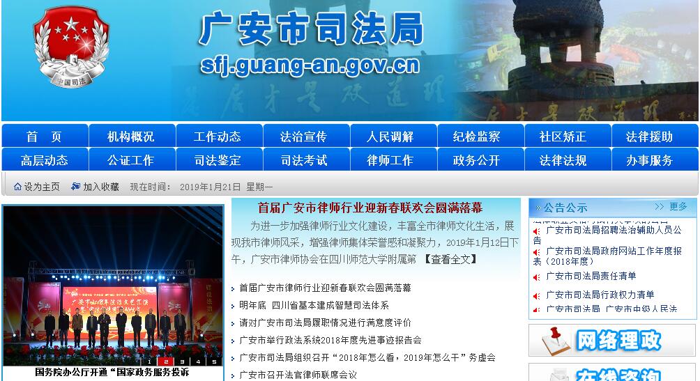 根据《中共广安市委广安市人民政府关于印发〈广安市人民政府机构改革方案〉和〈关于广安市人民政府机构改革方案的实施意见〉的通知》(广委发〔2010〕20号),设立广安市司法局,为市政府组成部门,单位主要职责有:(一)贯彻执行国家关于司法行政工作的方针、政策和法律、法规及规章,制订司法行政规范性文件,编制全市司法行政工作发展规划、工作计划并组织实施。(二)拟订普及法律常识规划和法制宣传教育计划并组织实施,指导全市各地、各行业的法制宣传和依法治理工作。(三)负责指导、监督全市律师工作、公证工作、外商台商投诉工作并承担相应责任,负责行政处罚工作。(四)监督管理全市的法律援助工作。(五)指导、监督全市基层司法所建设和人民调解、社区矫正、基层法律服务、帮教安置工作。(六)组织实施全市国家司法考试工作,指导法学教育和法学理论研究工作。(七)管理监督全市司法鉴定工作,负责全市司法鉴定人和司法鉴定机构登记管理的初审工作。负责仲裁机构、人员的审查登记工作。(八)指导全市司法行政系统依法行政工作,监督管理所属社团组织。(九)负责全市司法行政系统的计划、服装、警车等装备的管理工作,指导、监督直属事业单位的内部审计工作。指导全市司法行政系统信息化建设。(十)指导、监督司法行政系统队伍建设和思想政治工作,协助县(市、区)管理司法局领导干部,负责人事警务和干警培训工作。(十一)承担市政府公布的有关行政审批事项。(十二)承办市政府交办的其他事项。