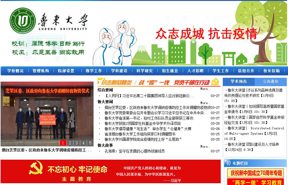 学校坐落在“中国最佳魅力城市”——烟台,是一所以文理工为主体、多学科协调发展的省属综合性大学。2012年,成为首批“山东省应用型人才培养特色名校”、服务国家特殊需求博士人才培养项目单位。2014年,获批教育学博士后科研流动站。原文化部部长、著名作家王蒙评价鲁东大学“人杰校灵”。学校于1930年始建于具有悠久历史文化的千年古县莱阳,历经山东省立第二乡村师范学校、胶东公学、莱阳师范学校、莱阳师范专科学校、烟台师范专科学校、烟台师范学院等历史阶段。2001年,原直属山东省交通厅、建校于1978年的山东省交通学校并入。2006年,学校更名为鲁东大学。八十余年来,学校始终同中华民族争取独立、自由、民主、富强的进步事业同呼吸、共命运,在革命、建设和改革中发挥了重要作用。以何其芳、吴伯箫、臧克家等为代表,一大批名师先贤在这里弘文励教。经八十余年之发展,学校秉承“厚德、博学、日新、笃行”的校训精神,砥砺耕耘,开拓进取,孕育形成了“求是至善、尚实致用”的校风,这一切融汇成一种巨大的内在精神力量,成为学校生生不息、发展壮大的动力之源。学校依山傍海,环境优雅,湖光山色,四季常青,是省级花园式单位和文明校园。校园占地3450亩,校舍建筑面积103万平方米。固定资产总值23.36亿元,教学科研仪器设备总值3.6亿元。拥有数字化语言文学1个国家级实验教学示范中心,计算机基础、生物学等2个省级实验教学示范中心。图书馆藏书250.3万册、电子图书102万种。在校生31000余人。学校坚持学科立校,学科实力不断增强。现设22个学院、74个研究院、85个本科专业,有1个博士后科研流动站、1个博士点、17个一级学科硕士点和5个二级学科硕士点(共计93个二级学科硕士点);有11个专业学位硕士点,含28个招生专业(领域)。拥有英语语言文学、载运工具运用工程、语言学及应用语言学、自然地理学、高等教育学、运筹学与控制论、区域经济学、港口海岸及近海工程、应用统计学等13个山东省重点学科,语言资源开发与应用1个山东省重点实验室,滨海湿地生态修复与保育、高性能与功能高分子材料、分子设计与材料合成、信息物理融合与智能控制、海洋生物技术、作物高产抗逆分子模块育种等6个“十三五”高校重点实验室。学校坚持以人才培养为中心,教学质量稳步提高。2007年,学校本科教学工作水平被教育部评为“优秀”。现有1个国家级大学生实践教育基地、1个国家级综合改革试点专业、5个国家级特色专业建设点、1个国家级教学团队、2个省级人才培养模式创新实验区、3个省级卓越工程师培养计划试点专业、15个省级品牌特色专业、8个省级高水平应用型立项建设专业(群),56门省级精品课程和3门省级双语教学示范课程。在近三届省级以上教学成果奖评审中,共获奖36项,其中国家级一等奖1项(参与)、二等奖1项,省级一等奖7项。是首批省级教师教育基地、首批山东省教育信息化试点高校。学校高度重视科研工作,科研水平逐步提高。现有教育部汉语辞书研究中心、山东省环渤海发展研究基地、山东省环渤海海洋经济协调可持续发展软科学研究基地等3个省部级人文社科研究基地,高性能纤维及其复合材料、滨海生态环境保护与修复、中华传统文化现代转换与海外传播3个省级协同创新中心,1个吸附与分离高分子材料省级工程技术研究中心,问题青少年教育矫正管理研究基地、中华文化海外传播与反观研究基地等2个山东省“十三五”高校人文社科研究基地。2016-2017年,共立项国家级项目78项、省部级项目178项;获得科研经费7360万元;发表SCI、SSCI、CSSCI论文517篇,出版著作80部,授权发明专利92项;获得省部级以上科研奖励105项。学校大力实施人才强校战略,师资队伍素质不断提升。现有专任教师1547人,兼职教师360人。专任教师中有教授194人,副教授496人,具有博士学位的教师891人,加拿大皇家学会(国家科学院)院士1人,国家“千人计划”入选者2人,国家“万人计划”入选者2人,国家百千万人才工程入选人员2人,教育部“长江学者”特聘教授1人,国家杰出青年科学基金获得者3人,文化名家暨“四个一批”人才1人,国家有突出贡献的中青年专家1人,国家“青年千人计划”入选者4人,中科院“百人计划”入选者6人,享受国务院政府特殊津贴专家18人,全国优秀教师(教育工作者)6人,山东省“泰山学者”特聘专家(海外特聘专家)4人,“楚天学者”1人,“泰山学者”青年专家2人,“新世纪优秀人才支持计划”入选者2人,入选“省智库高端人才首席专家”1人、入库专家2人,山东省有突出贡献的中青年专家16人,省杰出青年基金获得者2人,齐鲁文化英才1人,山东省高校重点学科(重点实验室、人文社科研究基地)首席专家5人,山东省教学名师13人。现有中国近现代史1个国家级教学团队,中国近现代史、现代汉语、教师教育、有机化学、应用物理等6个省级教学团队。学校坚持开放办学,国际交流日益频繁。学校是原国家教委首批公布的具有接收外国留学生资格的200所高校之一,先后与90多所大学或机构建立了友好交流合作关系,在联合办学、师生互派、学术交流等方面开展了广泛而深入的合作。现设蔚山船舶与海洋学院1个中外合作办学机构;与法国昂热大学、西部天主教大学合建卢瓦尔孔子学院,与韩国南部大学共建烟台世宗学堂