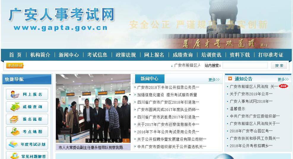 | 网站简介: 广安人事考试网由广安市考试指导中心主办。根据《关于调整广安市考试指导中心机构编制事项的通知》(广委编发〔2012〕7号)将广安市国家公务员培训中心职责并入广安市考试指导中心,广安市考试指导中心(增挂广安市公务员培训中心的牌子)为广安市人力资源和社会保障局管理的事业单位。广安市考试指导中心的主要职责:承担全市公务员录用考试、事业单位招聘考试、专业技术资格考试、执业资格考试的考务工作;负责考试信息的采集、数据处理、考试归档工作;负责考试试卷运送、保管、安全保密工作;对考试考务违规违纪行为进行认定,提出处理意见;参与制定有关人事考试政策;承担社会化考试的命题工作。承担公务员初任培训、科级干部任职培训、更新知识培训、专门业务培训,专业技术人员继续教育培训,军队转业干部岗前培训的组织和施教工作。 |