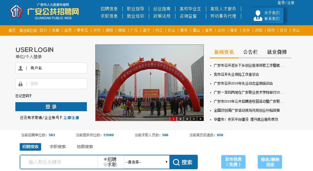 | 网站简介: 广安公共招聘网由广安市就业服务管理局主办。广安市就业服务管理局现有事业编制12个,事业人员控制数1名;设局长1名(副县级),副局长1名(正科级),副科级领导职数4名。内部设置为:局领导职数2人(一正一副),科室4个:即办公室、就业指导科(挂农村劳动力开发就业科、就业援助科牌子)、失业保险科、职业培训科(挂创业促进科牌子)。并受市人力资源和社会保障局委托,代管市劳动就业培训中心。其主要职责:一、宣传贯彻执行有关法律、法规和政策,参与制定全市就业发展规划、就业培训计划和就业救助计划并组织实施。二、承担就业服务工作,开发和管理公益性就业服务岗位。三、承办失业保险工作,负责失业人员参保的登记、调查、统计工作,核定缴费基数。负责失业基金的征缴、管理和支付工作。四、执行就业经费和失业保险基金管理制度,保证就业经费和失业保险基金安全和运营效果。五、承办上级交办的工作。 |