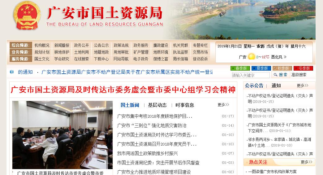 广安市国土资源局主要职责:(一)贯彻执行国家、省关于国土资源及测绘管理方面的方针、政策和法律、法规,承担保护与合理利用土地资源、矿产资源的责任;编制全市国土资源发展规划并组织实施,研究提出全市国土资源供需总量平衡的政策建议,贯彻实施国土资源领域资源节约集约利用和循环经济的政策措施。(二)承担规范国土资源管理秩序的责任。起草全市国土资源规定草案,制定实施细则并监督实施;制定地质环境保护的政策、实施细则;制定国土资源调查评价技术规程,拟订国土资源开发利用标准。负责本系统依法行政工作,依法查处区市县人民政府及其国土资源行政主管部门违反国土资源管理法律、法规的行为。(三)承担优化配置国土资源的责任。编制和组织实施全市土地利用总体规划、年度计划、土地整理复垦开发规划和其他专项规划、计划;组织编制矿产资源、地质勘查、地质环境规划和地质灾害防治、矿山地质环境保护等其他专项规划并监督检查执行情况。(四)负责规范国土资源权属管理。依法保护土地资源、矿产资源等自然资源所有者和使用者的合法权益;组织调处重大权属纠纷;指导土地确权,负责各类土地登记资料的收集、整理、共享和汇交管理,提供社会查询服务。(五)承担全市耕地保护的责任。确保规划确定的耕地保有量和基本农田面积不减少;牵头拟订并组织实施耕地保护政策;组织实施基本农田保护,监督占用耕地补偿制度执行情况;依法组织实施农用地转用和土地征收征用;指导未利用土地开发、土地整理、土地复垦和耕地开发的监督工作;承担报国土资源部和省政府审批的各类用地的备案、报批工作。(六)承担及时准确提供全市土地利用各种数据的责任。依法对广安区(含城区)的土地进行统一管理和监督;制定地籍管理办法并组织实施;组织土地资源调查、地籍调查、土地统计和动态监测;组织实施重大土地专项调查;依法承担土地确权、城乡地籍管理、土地定级和登记发证工作。(七)承担节约集约利用土地资源的责任。负责土地储备的监督和管理工作;拟订并实施土地开发利用管理办法,依法拟定、审查和批准供地方案;指导基准地价、标定地价测评;负责土地评估机构的备案、监管和成果审查;负责土地使用权价格备案。(八)承担规范国土资源市场秩序的责任。监测土地市场和建设用地利用情况;监管地价,规范和监管土地市场;规范和监管矿业权市场,组织对矿业权人勘查、开采活动进行监督管理;规范和监管国土资源相关社会中介组织的行为,依法查处违法行为。(九)负责矿产资源开发的管理。依法管理矿业权的审批登记发证和转让审批登记;负责地质勘查行业和矿产资源储量管理;组织实施地质调查评价、矿产资源勘查,管理市级地质勘查项目,组织实施市级重大地质勘查专项,管理地质勘查资质、地质资料、地质勘查成果,管理公益性地质调查和战略性矿产勘查工作;管理矿产资源评审、登记、统计,组织对矿产资源储量的调查,实施对矿山储量动态监督管理,承担压覆矿产资源初审工作。(十)承担地质环境保护的责任。组织、协调、指导和监督地质灾害防治工作,指导重大地质灾害应急处置,组织拟订、实施全市突发重大地质灾害应急预案;组织实施矿山地质环境、地质遗迹保护,监督管理古生物化石、地质遗迹、矿业遗迹等重要保护区、保护地,依法管理水文地质、工程地质、环境地质勘查和评价工作,监测、监督防止地下水过量开采和污染,承担城市地质、农业地质、旅游地质的勘查与评价工作;依法组织实施对地热水、矿泉水的鉴定和年度审理工作。(十一)编制本行政区域基础测绘规划并报经省测绘局备案后组织实施;负责行政区域内测绘资格证书的初审及报批工作;对本辖区内承担测绘任务的单位进行测绘资格验证,按规定进行测绘任务登记;依法查处破坏测绘标志和阻绕测绘人员依法测绘的案件。(十二)推进国土资源科技进步。组织开展对外合作与交流;组织制定实施国土资源科技发展、人才培养规划和计划;组织实施重大科技专项;推进国土资源信息化和信息资料公共服务。(十三)负责管理区市县国土资源主管部门领导班子成员和科级干部;负责区市县国土资源主管部门领导班子和系统的党风廉政建设、行业作风建设;监督检查有关财政性质资金的使用情况;负责广安区分局经费的管理。(十四)承担市政府公布的有关行政审批事项。(十五)承办市政府交办的其他事项。