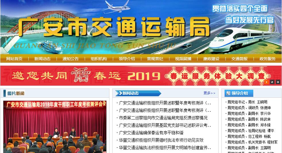 广安市交通运输局主要职责:(一)贯彻执行国家、省有关交通运输行业的方针、政策和法律、法规。拟订并监督实施公路、水路等行业规划,会同有关部门组织编制综合运输体系规划,参与拟订物流业发展规划。(二)拟订全市交通运输规范性文件草案,负责本系统、本部门依法行政工作,落实行政执法责任制。指导公路、水路行业有关体制改革工作,承担全市国省干道收费公路和重点公路的管理工作。(三)承担道路、水路交通运输市场监管责任,贯彻执行公路、水路运输有关政策、技术标准和运营规范,指导城乡客运管理和出租汽车行业管理工作。配合有关部门制定运输价格。(四)承担水上交通安全监管责任。负责水上交通管制、运输船舶及相关水上设施检验、登记和防止污染、救助打捞、通讯导航、危险品运输的监督管理工作,负责船员管理相关工作。指导水上交通安全事故、船舶及相关水上设施污染事故的应急处置,依法组织或参与事故调查处理工作。(五)负责提出公路、水路固定资产投资规模和方向、市财政性资金安排建议,按照规定权限审批(审核)、核准省、市规划内和年度计划规模内固定资产投资项目。指导交通运输行业审计工作。(六)承担公路、水路建设市场监管责任。贯彻执行公路、水路工程建设相关政策、制度、技术标准,组织协调公路、水路有关重点工程建设和工程质量、安全生产监督管理工作。负责对交通行业和产业项目的招标投标活动的监督执法。指导交通运输基础设施管理和维护,承担有关重要设施的管理和维护。按规定负责港口规划和港口岸线使用管理工作,指导交通运输行业特许经营管理。配合有关部门实施交通运输行业职业资格管理工作。(七)指导公路、水路行业安全生产和应急管理工作。按规定组织协调国家及省重点物资和紧急客货运输,负责全市重点公路及重点干线路网运行监测和协调。组织协调地方交通战备工作,承担国防动员有关工作。(八)贯彻执行交通运输科技政策,组织科技开发。指导全市交通运输信息化建设,监测分析运行情况,开展相关统计工作,发布有关信息。指导公路、水路行业环境保护和节能减排工作。(九)负责公路、水路有关涉外工作,开展对外经济技术交流与合作,指导全市交通运输行业招商引资和利用外资工作。(十)承担市政府公布的有关行政审批事项。(十一)承办市政府交办的其他事项。