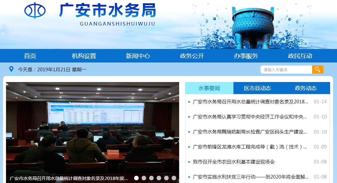 根据《中共广安市委广安市人民政府关于印发〈广安市人民政府机构改革方案〉和〈关于广安市人民政府机构改革方案的实施意见〉的通知》(广委发〔2010〕20号),设立广安市水务局(简称市水务局),为市政府组成部门。其主要职责:(一)统一管理水资源(含空中水、地表水、地下水),依法组织实施对地热水、矿泉水的管理工作;组织水资源和防洪论证工作,组织实施取水许可、水资源费征收制度;发布水资源公报和水质公报。(二)负责计划用水、节约用水规划;组织水功能区的划分;监测江河湖库及饮用水源等水域的水量、水质;审查湖泊、河道排污口的设置、改建和扩建。(三)负责水政监察和水行政执法。(四)负责对水务资金的使用进行管理、监督、审计。(五)负责江河综合治理与水资源、水能开发的综合规划、流域规划和专业规划并组织实施;组织指导城市防洪工作。(六)负责农村水利工作及水利工程的管理;组织、协调全市农田水利基本建设和指导乡镇供水工作,承担农田水利基本建设指挥部的日常工作。(七)组织实施职责范围内的地方电力管理工作。(八)负责江河行政管理,指导水利设施、水域及其岸线的管理与保护。(九)负责防治水土流失工作。(十)负责水务行业科学技术推广应用工作。(十一)负责水利行业职工队伍和服务体系建设。(十二)负责防治水旱灾害,承担市政府防汛抗旱指挥部的具体工作。