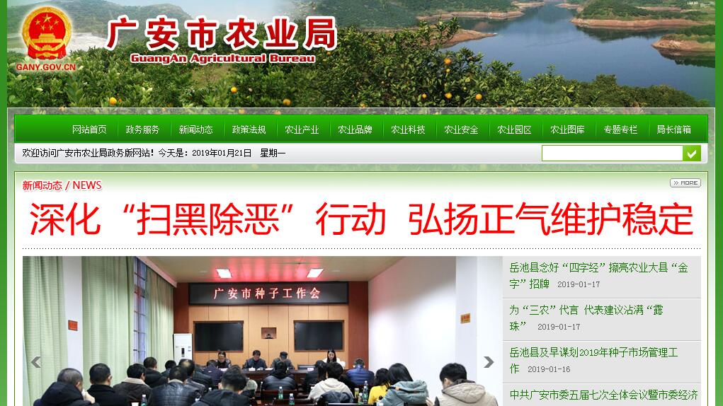 广安市农业局主要职责:(一)贯彻执行党和国家有关种植业、畜牧业、渔业、农业机械化、农垦等农业领域(以下简称农业)工作的法律、法规与方针、政策以及市委、市政府关于农业方面的决策部署,拟定全市农业和农村经济发展战略、中长期发展规划、政策并组织实施,提出农业产业保护的政策建议,推进农业依法行政。(二)承担完善农业经营管理体制责任,提出深化农村经济体制改革和稳定完善农村基本经营制度的建议,指导农村土地承包、耕地使用权流转和承包纠纷仲裁管理;指导、监督减轻农民负担和村民筹资筹劳管理工作,指导农村集体资产和财务管理;拟定农业产业化经营的发展规划与政策并组织实施,指导、扶持农业社会化服务体系、农村合作经济组织、农民合作社和农产品行业协会的建设与发展。(三)指导粮油、经作、畜禽、水产等主要农产品生产工作,组织落实促进粮油、经作、畜禽、水产等主要农产品生产发展的相关政策措施,引导农业产业结构调整和产品品质的改善;会同有关部门指导农业标准化、规模化生产,拟定农业开发规划并监督实施,负责提出农业固定资产投资规模和方向、有关财政性资金安排、财政政策和项目的建议并指导实施;参与组织实施种粮农民补贴、畜牧水产良种补贴、农机购置补贴和政策性农业保险工作。(四)指导农业产业化经营,促进农业产前、产中、产后一体化发展;组织拟订优势特色效益农业发展、现代农业产业基地建设等政策与规划并组织实施;提出促进大宗农产品流通政策,研究制订大宗农产品市场体系建设与发展规划,培育、保护和发展农产品品牌;负责指导休闲农业发展;负责生猪屠宰管理;组织协调“菜篮子”工程有关工作。(五)承担提升农产品质量安全水平的责任;组织开展农产品质量安全的监督管理,组织拟订农产品质量地方标准并会同有关部门组织实施和监督管理,负责农产品质量安全检测,依法开展市级农产品质量安全风险评估和质量追溯,发布有关农产品质量安全状况信息,指导农业检验检测体系建设,依法组织申报符合安全标准的农产品生产基地认定、产品认证、农产品地理标志登记保护和监督管理。(六)组织开展农业生产资料市场体系建设,承担农作物种子(种苗)、食用菌种、蚕种、草种、种畜禽、水产种苗、农药、兽药(渔药)、饲料、饲料添加剂等农业生产资料的许可及监督管理职责、监督管理兽医医疗器械、生物制品、肥料;会同有关部门监督实施农业生产资料地方标准、国家标准,参与农资市场秩序的整顿、规范和农资打假工作;承担渔政、渔港、渔船、渔机、网具的监督管理职责。(七)负责拟定农业机械化发展规划并组织实施,引进、示范和推广农业机械新技术、新机具,指导农业机械化基础设施建设的规划、建设和技术工作,指导农村机电提灌、机耕道建设,承担农业机械化使用安全监管职责。(八)负责农作物重大病虫害防治;起草动植物防疫和检疫的地方性管理办法、规定草案,会同有关部门制定动植物防疫检疫政策并指导实施;指导动植物防疫检疫体系建设,组织、监督动植物防疫检疫和疫情扑灭工作;组织植物检疫性有害生物普查;组织兽医医政和兽药药政药检工作。(九)承担农业防灾减灾责任,监测、核查、发布农业灾情,组织种子、种苗、化肥、兽药(渔药)、疫苗等农业生产救灾物资的储备和调拨,提出生产救灾资金安排建议,指导紧急救灾和灾后生产恢复。(十)管理农业和农村经济信息,监测分析农业和农村经济运行,开展农业统计工作;发布农业和农村经济信息,负责农业信息体系建设,指导农业信息服务。(十一)拟定农业科研、教育、农业技术推广的规划、计划和有关政策并组织实施,会同有关部门组织市级农业科技创新体系、农业产业技术体系建设;组织农作物、畜禽、水产养殖业等新品种和农业先进技术引进、试验、示范,组织实施农业领域的高新技术和应用技术研究、科技成果转化和技术推广,负责农业科技成果管理,指导农业技术推广体系改革与建设;负责农业植物新品种保护和农业转基因生物的监督管理。(十二)负责农业资源区划和资源保护工作,指导农用地、渔业水域、草山草坡、宜农滩涂、宜农湿地以及农业生物物种资源的保护和管理,负责水生野生动植物保护工作;依法管理耕地质量,拟订耕地及基本农田质量保护与改良政策并指导实施;运用工程设施、农艺、农机、生物等措施发展资源节约型、环境友好型农业。(十三)负责农村能源建设和资源环境工作,制定并组织实施农业资源环境建设规划,指导农村可再生能源综合开发与利用,指导农业生物质产业发展和农业农村节能减排,承担指导农业面源污染防治工作;提出划定农产品禁止生产区域的工作建设,指导生态农业、循环农业等发展;会同有关部门保护渔业水域生态环境。(十四)会同有关部门拟订农业农村人才队伍建设规划并组织实施,指导农业职业教育和农业职业技能开发工作,参与实施农村实用人才培训工程,承担农民教育培训工作,会同有关部门实施农业农村人才专业技术资格和从业资格管理有关工作。(十五)承办政府间农业涉外事务,参与拟订农业对外开放政策和外向型农业发展规划,指导外向型农业发展;组织实施农业“引进来”和“走出去”战略,促进农业贸易工作,组织开展农业领域国