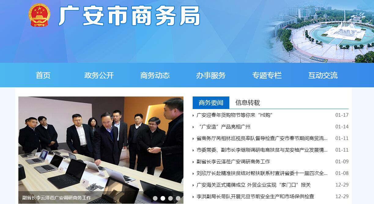 广安市商务局主要职责:(一)贯彻国家、省有关国内外贸易、外商投资和国际经济合作的法律法规和方针政策;拟订全市内外贸易、国际经济合作的相关政策、地方法规及政府规章;拟订全市商务发展规划、年度计划并组织实施。(二)承担全市服务业发展中组织实施的协调职责。推进流通产业结构调整,加快第三方物流发展;指导流通企业改革、商贸服务业和社区商业发展,提出促进商贸企业发展的政策建议;推动流通标准化和连锁经营、商业特许经营、物流配送、电子商务等现代流通方式的发展。(三)研究提出引导国内外资金投向市场体系建设的政策建议;编制大宗产品批发市场规划;指导城市商业网点规划和商业体系建设工作;推进农村市场体系建设,组织实施农村现代流通网络工程,促进城乡一体化发展。(四)承担牵头协调整顿和规范市场经济秩序工作的责任;拟订规范市场运行、流通秩序的政策;推动商务领域信用体系建设。(五)承担组织实施本市重要消费品市场调控和有关重要生产资料流通管理的责任,负责建立健全生活必需品市场供应应急管理机制,监测分析市场运行、商品供求状况,调查分析商品价格信息,进行预测预警和信息引导,按分工负责重要消费品储备管理和市场调控工作。(六)拟定促进转变外贸增长方式的政策措施,指导对外贸易行业执行国家进出口商品、加工贸易管理办法和进出口管理商品、技术目录;推进进出口贸易标准化工作;加强发展服务贸易相关工作,推进服务外包发展;指导贸易促进活动和外贸促进体系建设。(七)依法监督技术引进、设备进口、国家限制出口技术的工作;推进进出口贸易标准化工作;牵头负责发展服贸易的相关工作,推动服务外包平台建设。(八)承担组织协调反倾销、反补贴、保障措施及其他与进出口公平贸易相关工作的责任,建立进出口公平贸易预警机制,依法实施对外贸易调查和产业损害调查,指导协调产业安全应对工作及国外对我国出口商品的反倾销、反补贴、保障措施的应诉工作。(九)指导全市外商投资促进和管理工作,参与制订外商投资政策和改革方案并组织实施,统计分析全市外商投资情况,依法监督检查外商投资企业执行有关法律法规规章、合同章程的情况并协调解决有关问题,指导协调市内国家级经济技术开发区的有关工作。(十)负责全市对外经济合作工作,拟订并执行对外经济合作政策,依法管理和监督对外承包工程、对外劳务合作和出境就业等,承担境外投资管理的责任,牵头负责外派劳务和赴境外就业人员的权益保护工作,执行国家、省、市对外援助任务;管理多边、双边对本市的无偿援助和赠款(不含财政合作项目下外国政府对本市的赠款)。(十一)管理我市赴境外举办的各种商品交易会和经贸推介活动。指导管理以广安名义在境内举办的各种商贸交易会、展览会、展销会等活动。(十二)规划全市商务系统电子政务、公共商务信息服务体系建设并组织实施,推动电子商务发展。(十三)承担市政府公布的有关行政审批事项。(十四)承办市政府交办的其他事项。