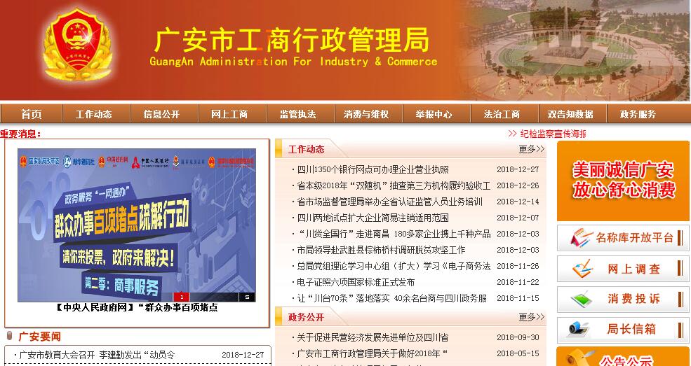 广安市工商行政管理局主要职责:(一)贯彻执行国家和省关于工商行政管理工作方针、政策和法律、法规;研究拟定全市有关工商行政管理工作的政策、措施和管理办法并组织实施;负责本系统、本部门依法行政工作,落实行政执法责任制。(二)依法组织管理全市各类企业(包括外商投资企业)、个体工商户、农民专业合作社和从事经营活动的单位、个人及外国(地区)企业常驻代表机构的注册,核定注册单位的名称,审定、批准、颁发有关证照并实行监督管理,查处违反企业注册登记管理法律法规的行为。(三)依法对全市各类传统市场和网络商品交易等新型市场的经营秩序实施规范管理和监督;监督管理租赁柜台经营活动、商品展销会和粮食、棉花、成品油等重要商品流通秩序;组织指导商品交易市场分类管理工作。(四)依法组织监督市场竞争行为,依法开展反垄断执法工作,依法查处不正当竞争、商业贿赂、走私贩私、传销等经济违法行为。(五)依法保护消费者合法权益,组织查处侵犯消费者合法权益案件;依法监督市场交易行为,组织查处假冒伪劣等违法行为;指挥、调度全市 12315 投诉举报网络的运行,受理消费者投诉、举报;依法对全市流通领域商品质量(食品药品除外)进行监管。(六)负责依法监督管理经纪人、经纪机构及经纪活动。(七)依法实施合同行政监管,组织查处合同违法案件,打击合同欺诈等违法行为,调解合同纠纷;依法组织管理抵押物登记;监督管理拍卖行为。(八)指导广告业发展;依法对广告和广告经营活动实施监督管理;依法对户外广告进行登记管理;组织查处违法广告。(九)负责商标管理工作;组织查处商标侵权案件、假冒商标案件、商标非法代理案件及商标违法案件,保护注册商标专用权;组织驰名商标和著名商标的推荐工作;监督管理商标印制;管理辖区内特殊标志;监督和指导商标代理、商标评估及商标民间社团组织的工作。(十)组织指导企业、个体工商户、农民专业合作社信用信息监督管理;承担内资企业、外商投资企业和个体工商户、农民专业合作社等登记注册信息的分析、公开工作;依法负责对各类市场主体经营行为和服务的监督管理工作。(十一)承担市政府公布的有关行政审批事项。(十二)承办市政府交办的其他事项。