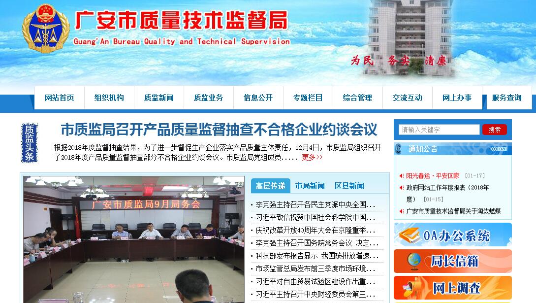 广安市质量技术监督局主要职责:(一)贯彻执行国家和省有关质量技术监督工作的方针、政策和法律、法规。(二)统一管理和指导全市质量工作;组织实施国务院质量发展纲要;负责拟订提高全市质量发展水平的发展战略规划;组织实施品牌战略;组织品牌产品创建工作;组织实施质量奖励制度,负责建立全市产品质量诚信制度;研究分析全市质量形势,发布质量信息。(三)统一管理全市标准化工作;组织实施标准化战略,贯彻国家标准化法律法规和方针政策;负责区域性地方标准的统一立项、制修订和发布工作;负责管理采标和企业产品标准备案工作;组织实施标准并对标准实施情况进行监督检查;指导协调有关行政主管部门和行业组织开展标准化工作;管理全市商品编码工作。(四)统一管理全市计量工作;负责建立和管理市级及以下社会公用计量标准和部门、企(事)业单位最高计量标准;组织推行法定计量单位和国家计量管理制度;建立全市量值传递和量值溯源体系;监督管理商品量、过度包装、市场计量行为、计量仲裁、计量检定机构及计量检定人员的资质资格;负责区域内能源计量监督管理和能效标识检查工作。(五)统一管理全市认证认可工作;监督管理全市认证认可活动;依法开展全市实验室资质认定监督检查工作;负责强制性认证产品、自愿性认证企业和食品农产品认证的监督工作;负责全市认证证书和认证标志的监督检查工作。(六)负责产品质量监督工作;组织实施本区域质量监督抽查工作;组织对重点产(商)品质量实施监督;负责产品质量事故的调查;负责产品质量的申诉处理;监督管理工业产品生产许可证工作;组织实施缺陷产品召回制度;负责纤维及制品质量监督检查工作;负责机动车安全检验机构的监督管理工作。(七)负责食品包装材料、容器、食品生产经营工具等食品相关产品生产加工的监管。(八)负责对全市特种设备安全实施监督管理;负责特种设备安全宣传教育,贯彻实施特种设备安全管理相关的法律、法规、规章;监督检查高耗能特种设备节能标准执行情况。(九)组织协调并查处生产领域质量违法行为;指导管理本行政区域内质量技术监督行政执法工作;查处违反质量、标准、计量、认证认可、特种设备安全等法律、法规的违法行为;组织开展打击假冒伪劣活动;负责本行政区域内质量技术监督投诉、申诉和举报工作;承办上级质监部门交办、督办案件的查处工作;负责跨区域质量案件的协调和查处工作。(十)组织协调行业和专业的质量技术监督工作;制定并组织实施质量技术监督事业发展规划和技术机构建设规划;负责组织协调组织机构代码管理工作;组织实施地理标志产品保护工作。(十一)负责市政府公布的有关行政审批事项。(十二)承办市政府交办的其他事项。