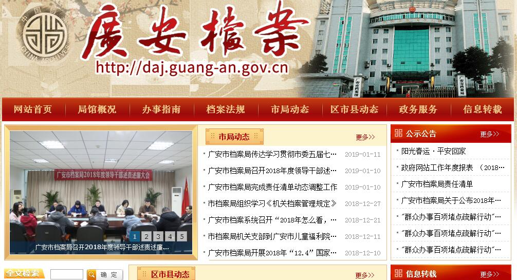 广安市档案局(馆)是广安市人民政府参照公务员法管理的直属事业单位,实行局(馆)合一的体制,一套机构,两块牌子,内设办公室、业务指导科、馆务建设科、政策法规科、征集编研科和信息技术科6个机构,履行全市档案事业的行政管理和市直机关、团体、企事业单位档案保管、使用两种职能。具体职责为:贯彻执行《中华人民共和国档案法》以及党和国家、省有关档案工作的方针、政策;起草全市档案工作的地方规范性文件草案,完善档案管理的政策和规章制度;监督、检查档案法律法规的贯彻执行,依法查处档案违法行为。制定全市档案事业发展的中长期规划和年度计划,并组织实施。组织指导全市档案理论、档案科研和档案宣传工作,逐步实现档案管理的标准化、科学化和现代化。负责全市档案人员的业务培训,指导全市档案人员队伍建设,开展全市档案专业中级技术职务评审工作。征集接收、集中保管市级机关、企事业单位到期档案、重大活动档案、珍贵特色档案、公开现行文件。运用信息化手段,开发档案信息资源,提供档案及现行文件利用;开展档案编研工作,举办档案展览。承办市政府交办的其他事项。广安市档案馆是广安行政区域内集“党和国家重要档案的安全保管基地、爱国主义教育基地、档案利用中心、政府信息查阅中心、电子文件中心”等多功能为一体的地方国家综合档案馆。馆藏档案全部为建国后档案,起止年代为1954年—2005年,共有108个全宗75174卷214900件,馆藏照片档案1852张,实物375件,印章304枚,光盘135张,资料1341册。2011年7月,广安市档案馆创建为国家一级档案馆。广安市档案馆编撰有《广安市档案馆指南》、《广安大事记》、《广安档案综合史料集萃》、《真情难忘——致富思源共建广安活动实录》、《奇葩荟萃——广安行业名片集锦》、《邓小平百年诞辰纪念活动史料选编》、《广安市经济社会发展基础数据汇编》、《广安市历届党代会简介》、《广安市历届人代会简介》、《广安市历届政协会简介》和《鉴证辉煌——广安建地设市20周年档案记忆》、《广安市重大活动专题概要汇编(1993-2010)》、《世纪伟人——邓小平同志图片集》、《即将逝去的记忆》、《坚实的足迹——广安市重大活动纪略(2011-2015)》等档案史料,供各项工作参考。根据《中华人民共和国档案法》的规定,结合实际,广安市档案馆向社会开放了破产改制企业13个全宗35897卷档案,凡中华人民共和国公民,都可以持合法身份证件到广安市档案馆利用已开放档案。其主要职责:一、贯彻执行《中华人民共和国档案法》以及党和国家、省有关档案工作方针、政策;起草全市档案工作的地方性文件草案,完善档案管理的政策和规章制度;监督、检查档案法律法规的贯彻执行,依法查处档案违法行为。二、制定全市档案事业发展的中长期规划和年度计划,并组织实施。三、组织指导全市档案理论、档案科研和档案宣传工作,逐步实现档案管理的标准化、科学化和现代化。四、负责全市档案人员的业务培训,指导全市档案人员队伍建设,协助市级有关部门做好全市档案专业技术职务评审工作。五、负责收集保管范围内对国家和社会具有保存价值的档案;采取有效管护措施,维护档案的完整与安全;开发档案信息资源,为社会利用档案资源提供服务;六、负责对所保存的档案进行科学的管理,逐步实现档案管理标准化、科学化和现代化;七、承办市政府交办的其它事项。