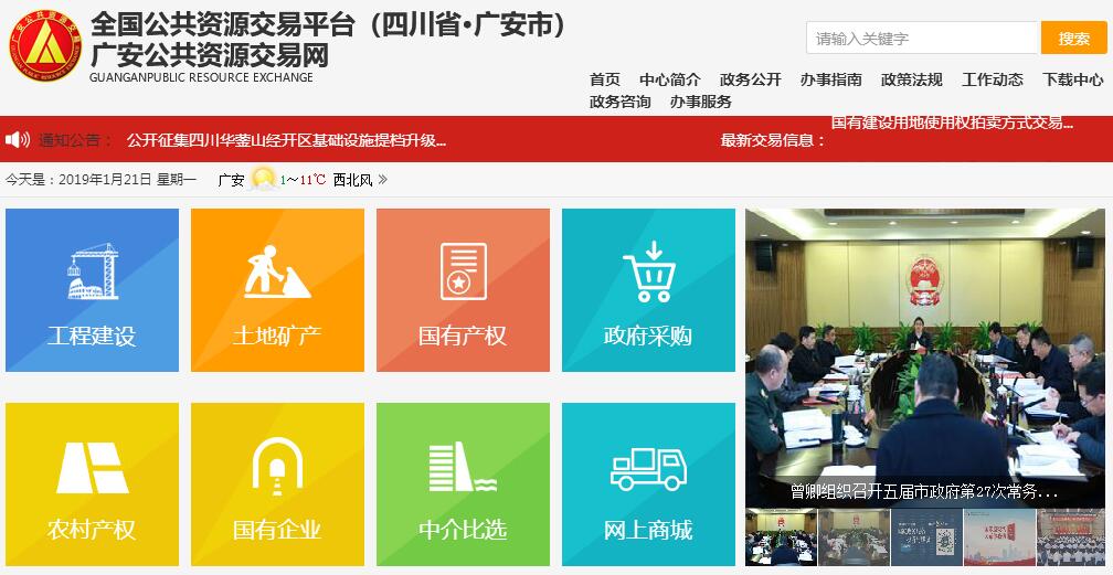 广安市公共资源交易中心(以下简称中心)于2012年11月21日正式挂牌运行,系市人民政府管理的正县级事业单位,受委托依法承担政府投资工程建设项目招标投标、土地使用权和矿业权出让、国有产权交易、政府采购等公共资源交易事项的实施和服务工作。中心现设综合科、交易受理科、交易编审科、交易组织科、交易评审科、交易监督科、信息技术科7个内设机构。根据《中共广安市机构编制委员会关于设立公共资源交易中心区市县分中心的批复》精神,2016年7月设立了广安市公共资源交易中心广安区分中心、前锋区分中心、华蓥市分中心、岳池县分中心、武胜县分中心、邻水县分中心。根据《中共广安市机构编制委员会关于设立广安市政府采购中心的批复》精神,重新设立了广安市政府采购中心,为市政府管理的事业单位,与市公共资源交易中心合署办公。中心核定事业编制23名,工勤人员控制数2名。设主任1名(正县级),副主任3名(副县级),正科级领导职数7名。人员经费为财政核定收支、定额补助的预算管理体制。目前在编在岗人员19名,已配备主任1名、副主任1名。按照“公开、公平、公正、依法、廉洁、高效”原则,提高工作质量和办事效率,做好公共资源交易工作,为交易各方服务,为财政增收节资,推动广安经济和社会事业又好又快发展。其主要职责:(一)贯彻执行公共资源交易的相关政策、法律、法规,落实中、省、市关于公共资源交易的决策部署。受委托依法承担政府投资工程建设项目招投标、土地矿产资源交易、国有产权交易及政府采购实施和服务工作。(二)为公共资源交易活动提供场所、设施、信息、咨询和现场管理服务,承担市本级公共资源交易平台和农村产权交易平台建设和管理。(三)按规定制定市级公共资源交易现场管理规章制度、工作流程和服务规范并组织实施,推行公共资源交易服务集中化、流程化、标准化。(四)负责对公共资源项目进场交易各方主体及交易手续进行现场监督管理、实施评价,建立从业行为规范制度,开展场内信用信息记录、评价并对外发布。制止和纠正违反现场管理制度的行为;按职责分工受理投诉和处理违规行为。(五)参与对市直部门(单位)公共资源交易综合效益评价、评估工作,为相关行业部门监管提供协助。(六)对区(市)县公共资源交易中心进行业务指导,组织相关业务工作的调研和培训。(七)贯彻执行国家、省、市环境保护法律法规,对各科室履行环境保护责任情况进行监督管理,对区市县分中心环境保护工作进行指导,定期向本级党委、政府报告履行环境保护职责情况。(八)承办市委、市政府交办的其他事项。