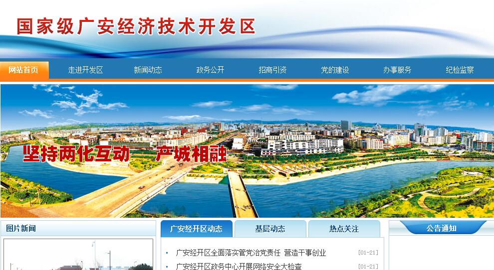 广安经济技术开发区设立于1995年7月,1996年1月经四川省人民政府批准为省级开发区,2006年1月经国家发改委、国土资源部和建设部审核保留为省级经济开发区,2010年6月经国务院批准为国家级经济技术开发区,现规划面积103平方公里,下辖新桥工业园区、奎阁工业园区和临港工业园区。■新桥工业园区■ 四川省确定的气盐结合的精细化工基地,重点发展能源、化工、有色金属、建材等产业。园区2007年启动建设,现已入驻中石油、中国建材、北控水务、河北诚信、广安科塔等一批重点龙头企业,项目总投资160亿元,全部建成可实现产值350亿元。■奎阁工业园区■ 重点发展电子电器、装备制造、新型材料、纺织服装、机械及农产品加工等产业。园区2003年5月启动建设,已引进华通钢缆、先科冰箱、浙江纺织、重庆佰亿、鑫宇电子、静屹光纤、长安跨越等一批重大项目,总投资50亿元,全部建成可实现产值150亿元。■临港工业园区■ 以广安国防科技工业产业园为依托,重点发展应急抢险、航天科技、高新材料、高分子材料、生物工程、新能源汽车、仓储物流等产业。力争用5-10年的时间,完成投资100亿元,将园区打造成拥有一批具有自主知识产权、核心技术和国际竞争力的军民结合的特色园区,产值超过500亿元。