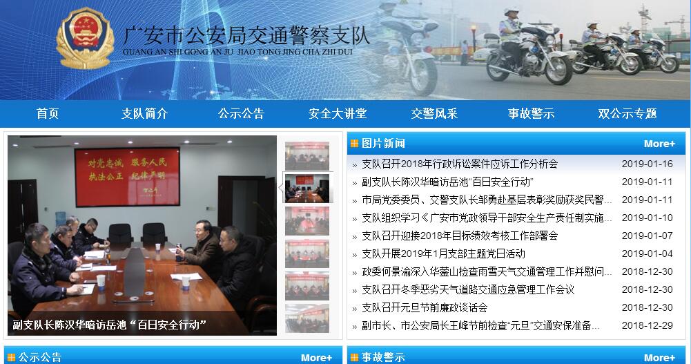 | 网站简介: 广安市公安局交警支队成立于1993年10月,为市公安局内设副县级单位,现有警力334。 |
