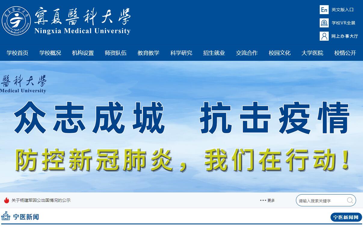宁夏医科大学前身是1958年建立的宁夏医学院。1962年改称宁夏大学医学系。1972年,上海铁道医学院搬迁至银川,与宁夏大学医学系合并重建宁夏医学院。2002年,宁夏卫生学校、宁夏护士学校并入宁夏医学院。2008年8月,学校更名为宁夏医科大学。2014年,宁夏师范学院医学院并入宁夏医科大学,至此,宁夏医科大学成为宁夏唯一一所高等医学教育学府。学校有雁湖、双怡两个校区。设有13个教学机构,11个教辅科研机构,具有较为完善的大学医院系统,有12所附属医院(直属附属医院2所,直属附属专科医院3所),17所教学医院,50余所实习医院和实践教学基地。其中总医院是宁夏规模最大的综合性三级甲等医院,是区域性的医疗、科研、教育、考试和培训中心,医疗服务辐射宁夏全区和内蒙、甘肃、陕西等毗邻地区。附属回医中医医院是自治区唯一的公立回医医院,是国家中医药管理局重点建设的三级甲等民族医医院。学校现有教职员工及医护人员7400余人(含直属附属医院),其中专任教师866人,副高以上职称674人。教师中有双聘院士1人,研究生导师532人(其中博士生导师29人)。全日制在校生8927人,其中,博士、硕士研究生1778人,留学生347人。学校坚持“艰苦创业、自强不息,开放办学、内涵发展,强化特色、注重创新,全面提高教育质量和效益”的办学理念,有医学、理学和管理学3个学科门类,形成了以医学为主,中西医并存,多学科协调发展的学科专业体系。开设有21个本科专业,其中临床医学、中医学、预防医学、护理学、药学为国家级特色专业,有5个自治区级重点专业群。目前,拥有3个一级学科博士学位授予点,8个一级学科硕士学位授予点,5个专业学位授权单位。2010年成为国家教育体制改革研究生教育改革试点项目高校。“十二五”以来,学校共承担各级各类科研项目3353项,其中国家级科研项目444项,研究经费达3.16亿元。学校坚持开放办学理念,重视与国内外高校的交流与合作,先后与15个国家或地区的近30所院校和科研机构建有友好合作关系,广泛开展人才培养与科研交流合作。学校依托民族地区优势,积极开展回医药教育与研究,回医药逐步形成了科研、教学、临床及文化交流为一体的办学特色。目前,宁夏医科大学已发展成为一所规模、结构、质量、效益协调发展,在全国同类院校中有一定影响力和知名度的高等医学院校。“十三五”期间,学校将不断加强内涵建设,突出办学特色,提高办学水平,为实现“两个一流”(西部一流、有一流学科)和建设西部地区有特色、现代化、高水平的教学科研型医科大学继续努力。