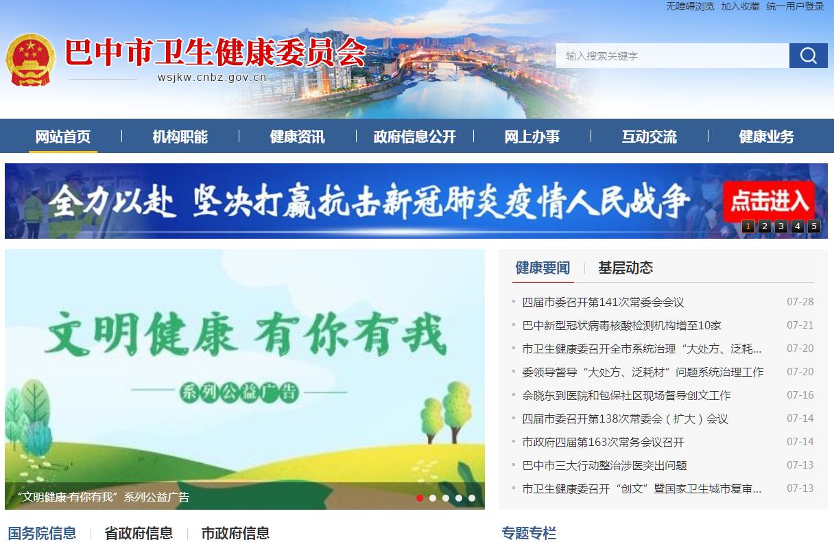 巴中市卫生健康委员会主要职责:(一)组织拟订全市卫生健康政策。贯彻执行党和国家、省委、省政府和市委、市政府、省卫生健康委关于卫生健康工作和方针、政策与法律法规及工作部署,负责起草卫生健康事业发展的规范性文件草案、政策、规划,制定卫生健康技术规范并组织实施。统筹规划全市卫生健康服务资源配置,指导全市卫生健康工作。制定并组织实施推进卫生健康基本公共服务均等化、普惠化、便捷化和公共资源向基层延伸等政策措施。(二)牵头推进全市深化医药卫生体制改革。研究提出深化医药卫生体制改革重大政策、措施的建议。牵头负责全市分级诊疗、现代医院管理、全民医保、药品供应保障、综合监管5项基本医疗卫生制度建设。制定并组织实施推动卫生健康公共服务提供主体多元化、提供方式多样化的政策措施。(三)制定并组织落实全市疾病预防控制规划、免疫规划、严重危害人民健康的艾滋病等重大传染病、寄生虫病、地方病等公共卫生问题的干预措施。负责全市卫生应急工作,组织和指导全市突发公共卫生事件预防控制和各类突发公共事件的医疗卫生救援。发布法定报告传染病疫情信息、突发公共卫生事件应急处置信息。依照国家检疫传染病和监测传染病目录,参与开展检疫监测工作。(四)贯彻落实国家应对人口老龄化政策措施。负责推进老年健康服务体系建设和医养结合工作。承担市老龄工作委员会日常工作。(五)贯彻落实国家药物政策和国家基本药物制度。组织执行国家药品法典和国家基本药物目录,执行基本药物使用的政策措施。组织实施食品安全风险监测。开展食品安全企业标准备案。(六)负责职责范围内的职业卫生、放射卫生、环境卫生、学校卫生、公共场所卫生、饮用水卫生等公共卫生的监督管理。负责传染病防治监督,健全全市卫生健康综合监管体系。(七)制定全市医疗机构、医疗服务行业管理办法并监督实施,建立医疗服务评价和监督管理体系。会同有关部门实施卫生健康专业技术人员资格标准。制定并组织实施医疗服务规范、标准和卫生健康专业技术人员执业规则、服务规范。负责医疗机构、人员和行为的日常监管。负责建立公益性导向的绩效考核和评价运行机制,推进和谐医患关系建设,提出医疗服务和药品价格政策的建议。(八)负责全市计划生育管理和服务工作。开展人口监测预警,研究提出人口与家庭发展相关政策建议,完善计划生育政策。指导市计划生育协会的业务工作。(九)指导县(区)卫生健康工作。指导基层医疗卫生、妇幼健康服务体系和基层卫生队伍建设。推进卫生健康科技创新发展。(十)负责市确定的保健对象的医疗保健工作。负责市直有关部门(单位)离休干部医疗管理工作。负责重要领导、重要外宾来雅期间的医疗卫生保障工作。负责重要会议与重大活动的医疗卫生保障工作。(十一)承担全市中医药事业发展和管理工作。(十二)依法依规履行卫生健康行业安全生产监管职责。负责职责范围内的生态环境保护、审批服务便民化等工作。(十三)完成市委、市政府交办的任务。