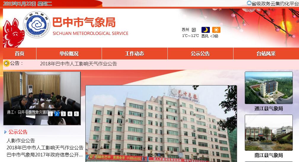 巴中市气象局成立于1997年12月,实行四川省气象局和巴中市人民政府双重领导以四川省气象局领导为主的管理体制,为正县(处)级全民所有制事业单位,主要承担巴中市行政区域内大气探测、气象通讯、天气气候预测、气象服务、气候资源开发利用、人工影响天气、防雷减灾以及气象行政执法和行业管理等工作。巴中市气象局成立以来,经过全市气象工作者艰苦奋斗、扎实工作,为巴中经济建设和社会事业发展做出了重大贡献,多次受到各级党委、政府和上级气象主管部门的表彰,先后被省委、省政府评为抗旱减灾工作和抗灾减灾工作先进单位,两次被中国气象局评为重大气象服务先进集体,县(区)气象局均建成了市级最佳文明单位,市气象局建成省级文明单位,全市气象部门先后被四川省气象局和巴中市委、市政府命名为文明气象系统和文明行业。巴中市气象局下辖巴州区、通江县、南江县和平昌县四个县区气象局(站);内设办公室(人事教育科、监察审计室)、业务科技科(法规科)、计划财务科三个职能科室和市气象台、气象信息中心、气象探测中心、公共气象服务中心、财务核算中心五个直属事业单位;管理巴中市防雷中心、巴中市人工影响天气办公室两个地方气象事业机构。全市建有国家基本气象站和农业气象一级站各1个、国家一般气象站3个、区域自动观测站217个、土壤湿度观测站4个。全市气象部门编制员额94人,其中,行政管理岗位29人,基本业务岗位56人,事业单位管理岗位9人。