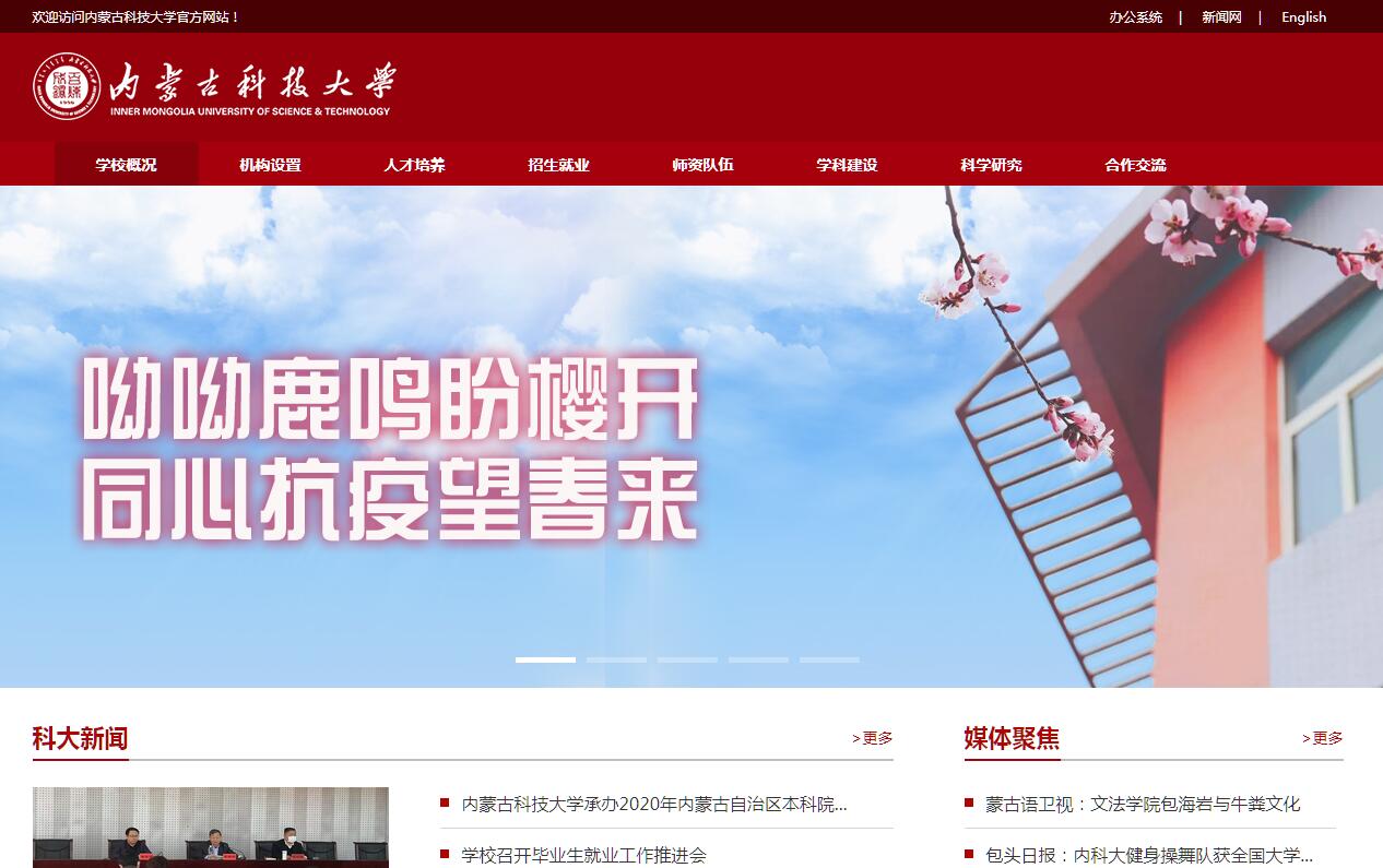 内蒙古科技大学坐落在首批全国文明城市、美丽的草原钢城——包头,前身为1956年建校的包头钢铁工业学校和包头建筑工程学校,隶属原冶金工业部,1958年两校合并组建包头工学院,1960年更名为包头钢铁学院,1998年划归内蒙古自治区管理,实行中央与地方共建,2000年内蒙古煤炭工业学校并入,2003年更名为内蒙古科技大学。1997年通过教育部本科教学合格评价,2008年以优秀等次通过教育部本科教学工作水平评估。1986年联合培养硕士研究生,1991年成为硕士学位授权单位,2013年成为博士学位授权单位。学校现已发展成为以冶金、矿业、煤炭、稀土为特色,以工为主,工、理、文、管、经、法、艺术、教育等学科协调发展,集研究生教育、本科教育、高职教育、继续教育、留学生教育为一体的多科性大学。学校设有学院、部、中心等教学单位20个。现有一级学科博士学位授权点2个,一级学科硕士学位授权点12个,二级学科硕士学位点10个,专业硕士学位授权领域11个。本科专业66个,其中国家特色专业建设点4个,教育部卓越工程师教育培养计划专业3个,工程教育认证专业2个,教育部专业综合改革试点1个,自治区专业综合改革试点1个,自治区级重点建设专业4个,自治区级品牌专业22个,现有自治区级精品课程53门。学校现有专任教师1335名,其中高级职称629人,具有博士、硕士学位1123人,博士生导师19人,硕士生导师446人(校外兼职导师148名)。教师队伍中拥有全国杰出专业技术人才、全国首批“新世纪百千万人才工程”入选者、内蒙古首次“科教兴区”特别奖获得者、内蒙古首位中组部“千人计划”入选者、内蒙古首批国家杰出青年基金获得者,还有“长江学者特聘教授”、国家特支计划国家重点领域创新团队、教育部创新团队,自治区教学名师、教学团队等。学校现有各类全日制在校生24281名。60多年来,为国家输送了10万余名合格人才,毕业生就业率连续多年位居内蒙古高校领先水平,2000年、2009年学校2次被教育部评为“全国普通高校毕业生就业工作先进集体”,2010年成为50家“全国毕业生就业工作典型经验高校”之一,2012年,学校被中华人民共和国国务院授予“全国就业先进工作单位”光荣称号(全国共15家高校)。学校拥有省部级重点学科9个,国家地方联合工程研究中心1个,省部共建国家重点实验室培育基地1个,内蒙古协同创新中心1个,内蒙古协同创新培育中心1个,省部共建教育部重点实验室1个,内蒙古新型科技研究开发机构1个,内蒙古工程研究中心1个,内蒙古重点实验室15个,内蒙古工程技术研究中心6个,院士专家工作站3个,内蒙古哲学社会科学研究基地1个,内蒙古高校人文社会科学研究基地1个,内蒙古高校创新方法推广应用基地1个,自治区生产力促进中心2个,国家级“本科教学工程”大学生校外实践教育基地2个,省部级实验教学示范中心9个。学校积极面向经济社会发展开展科学研究,先后获得国家级科技进步二等奖1项、三等奖1项,教育部科技进步一等奖1项,内蒙古自然科学一等奖4项、科技进步一等奖11项,科研获奖位居内蒙古高校前列。近五年来,学校承担国家973计划项目、国家863计划项目、国家重点研发计划、国家科技支撑计划、国际合作项目、军工项目、国家自然基金、国家社科基金、教育部人文社科项目等国家级科研项目264项,被三大检索收录论文1778篇,获授权专利574项,其中发明专利244项。白云鄂博矿多金属资源综合利用创新团队研制出的矿渣微晶玻璃管材,被确定为生产该类产品的国家行业标准,并已实现产业化。学校2008年被内蒙古自治区政府评为“科技创新先导型大学”,2010年被国家知识产权局评为全国知识产权试点单位。学校学生课外科技创新成果显著,近三年获得省部级以上各类学生课外科技作品竞赛奖励586项,其中国家级奖励188项,公开发表的学术论文60篇,获批专利56项。大学生创业孵化基地被共青团中央授予“全国大学生创业示范园”称号(内蒙古高校唯一一家),被自治区人社厅、财政厅、科技厅认定为全区首批“自治区大学生创业孵化基地”、“自治区示范性创业园创业孵化基地”、“内蒙古自治区众创空间”等荣誉称号。学生竞技体育走在全国高校前列:截止2016年,我校运动员在国内外体育竞赛中获省部级及以上奖牌396枚,其中国际体育竞赛金牌9枚,国家级体育竞赛金牌26枚,省部级体育竞赛金牌168枚。在全国大学生田径最高级别比赛上,我校连续七年获得全国高校前十名。我校学生运动员连续五届代表国家参加世界大学生运动会田径项目并获得一金四银一铜,先后代表国家参加三届世界大学生越野锦标赛,三名学生运动员曾参加2004、2008、2016年的奥运会。2011年学校当选全国大体协副主席单位,2014年在自治区率先成立内蒙古西部校园足球联盟和内蒙古校园足球联合会并被自治区命名为内蒙古自治区青少年足球夏令营活动基地,为内蒙古校园足球事业做出了应有的贡献。学校坚持开放办学,积极开展对外交流与合作办学,先后与30多个国家和地区的50多所高等院校和科研机构建立了交流合作关系,在教学、科研和人才培养方面开展了全面合作。学校引进智力,促进发展,先后聘请彭苏萍、薛其坤院士等168名专家任兼职或客座教授。学校作为内蒙古自治区高校管理体制改革试点单位,大力进行内部管理体制改革,在坚持党委领导下的校长
