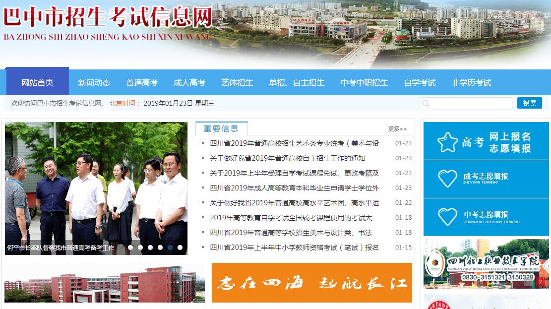 | 网站简介: 巴中市招生考试信息网由巴中市大学中专招生委员会办公室,巴中市高等教育自学考试委员会办公室主办。 |