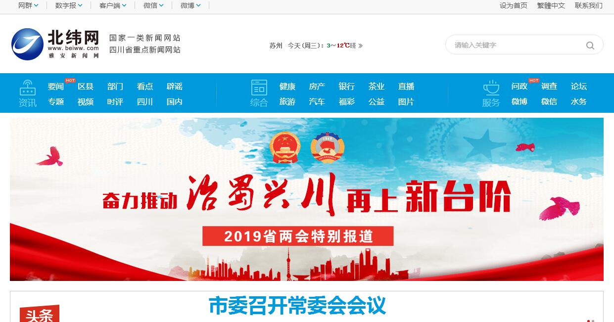 北纬网(www.beiww.com)由雅安日报传媒集团主办,是雅安综合性新闻门户网站,于2007年5月26日正式上线。获得了互联网新闻信息服务国新网许可51120170012号,增值电信业务经营许可证川B2-20080121,广播电视节目制作经营许可证川字第069号,是雅安市继雅安日报、雅安电视台之后的又一主流媒体。从发布信息的及时性、点击量和覆盖面来看,北纬网已成为雅安目前最大的宣传媒体。截止2014年12月,北纬网群日均点击量超过100万人次,其中80%以上点击量为雅安本地网民;点击涉及地域覆盖所有省、市(区)、香港、澳门、台湾和200个国家(地区);论坛注册会员超过44万人,其中90%以上为雅安本地人注册。内容丰富,信息量大,特色突出,更新及时。2007年以来,北纬网先后获得中国百强新闻网站、中国最具区域性影响力门户网站、全国地方网站创新发展杰出贡献奖、全国地方十强新闻网站、全国地方门户网站十佳品牌、中国地方网站最具投资价值品牌奖、2012四川十大最具影响力网站、中国新媒体抗震救灾特别贡献奖等荣誉称号。历经8年发展,北纬网旗下已拥有中国熊猫网中英文版、华夏茶业网、雅安网络电视台、北纬手机报、掌上雅安手机客户端、雅安看点微信公众号等子媒体,形成了北纬网新媒体集群,在国内产生了一定的影响力。推出了省内二级城市第一家手机报——北纬手机报,全市副科级干部均已开通。还推出了北纬直播室,可以不受时间限制的进行全球网络直播等优势。权威性强,可读性强,互动性强;本地内容丰富,页面精美,点击量高,覆盖面广,是北纬网的主要特点。