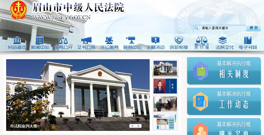眉山中院是1997年因行政区划调整而成立的年轻法院,下辖二区四县6个基层人民法院、18个人民法庭。下设1个事业单位法官培训中心,挂靠设立2个正县级单位司法调解中心、诉调对接中心。内设10个审判部门、11个综合部门。其中,诉调对接中心、司法公开办公室和诉讼辅导室为2012年后增编设立。眉山中院机关位于眉山市眉州大道东二段4号,审判综合楼于2004年6月建成投用,占地面积35亩,建有5个设施完善、功能齐全的审判法庭,配有6间调解室。眉山中院现有政法编制干警116人、员额法官40名,年均办理案件约4000余件。2012年以来,眉山中院在省法院的有力指导和市委的坚强领导下,紧紧围绕争创“两个一流”的战略目标和市委“主动作为创一流”的工作要求,按照“三台互动,奉法善治”的工作思路,公正为民、求实奋进,在审判执行、队伍建设和法院改革各项工作中不断攻坚克难、创新突破,被最高法院确定为全国“诉非衔接”改革试点法院,被命名为“全国司法公开示范法院”,被省法院确定为争创“两个一流”示范法院、文化建设示范法院。全市法院工作受到省市领导肯定批示逾百次,9名干警被评为全国法院先进个人,1名干警被评为“全国审判业务专家”、“全省十大优秀中青年法学专家”,7名干警荣记“个人二等功”。“诉非衔接”改革试点工作成效在最高法院阶段评估、终期评估中位列全国第一,形成“党政主导各方推进、解纷网络全面覆盖、司法推动科技助力、辅分调审有序化解”的多元化纠纷解决机制改革“眉山经验”,被中央改革办选编为十八大以来改革成功30大案例之一,先后在全省社会治理眉山现场会、全国多元化纠纷解决机制改革“眉山会议”上向全省、全国推广,最高法院周强院长2014年、2015年连续两年亲临视察指导,最高法院院长周强、省委书记王东明、时任省委政法委书记刘玉顺、省法院院长王海萍和市委书记李静分别多次批示肯定,被最高法院表彰为“多元化纠纷解决机制示范法院”。东坡法院获得“全国优秀法院”称号,彭山法院获得“全国文明单位”称号,东坡、丹棱法院通过“全国无执行积案先进法院”验收,仁寿法院刑事庭、龙正法庭,洪雅法院余坪法庭等被评为全国法院先进集体。